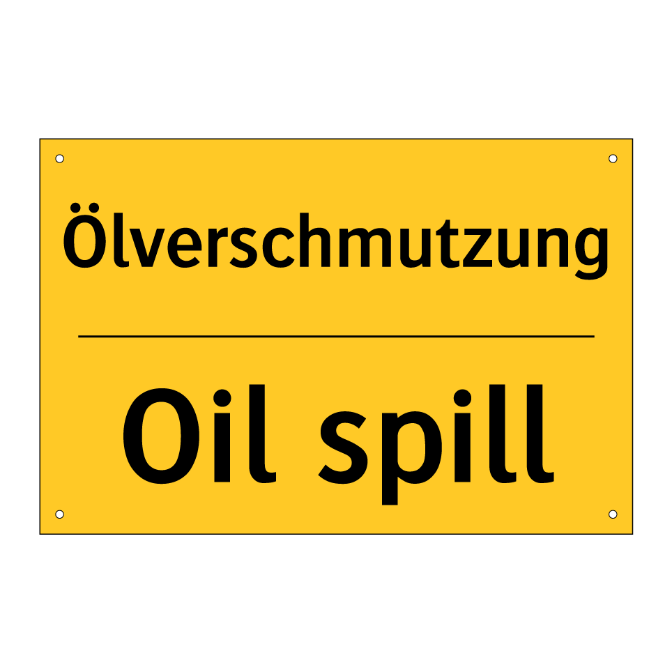 Zweisprachiges Warnschild mit deutschem Text Ölverschmutzung und englischem Text Oil spill