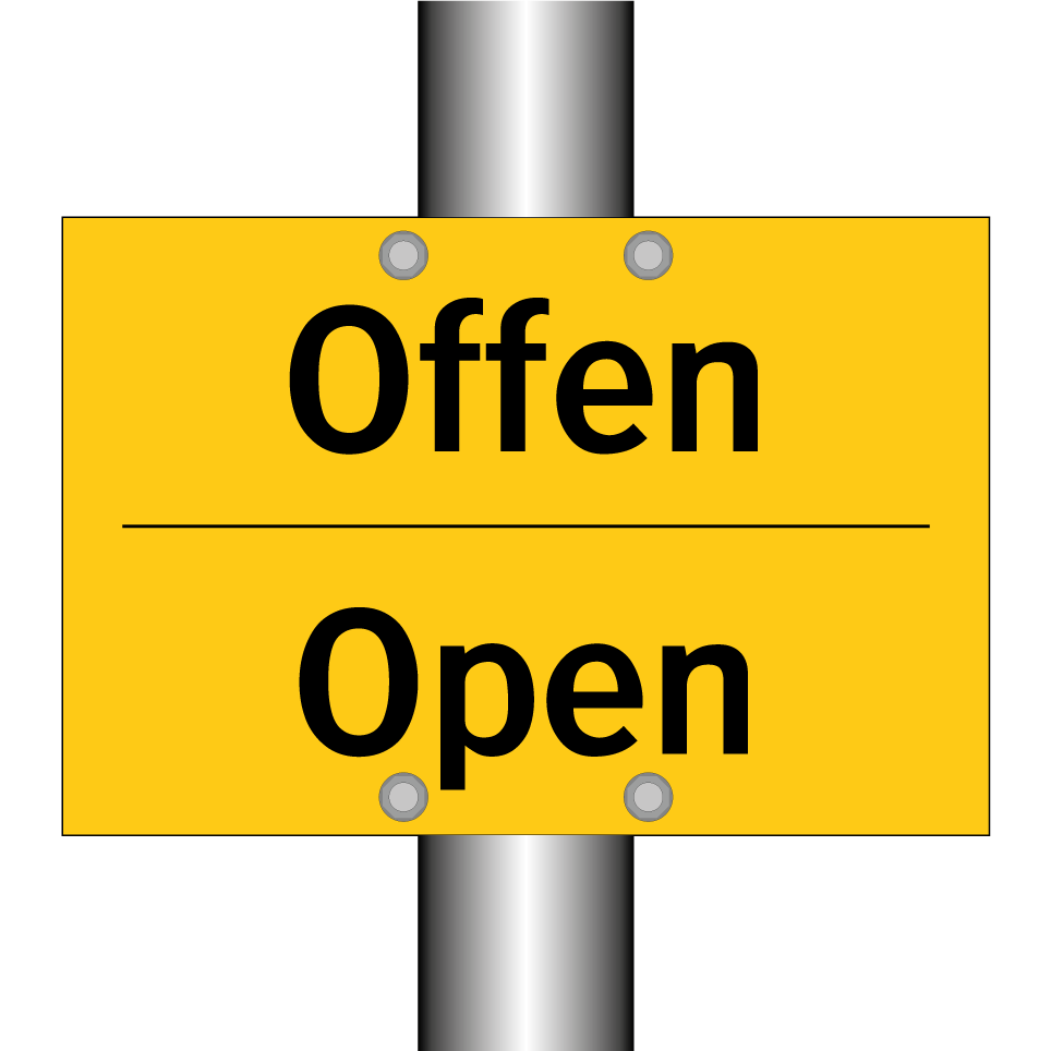 Zweisprachiges Warnschild mit deutschem Text Offen und englischem Text Open