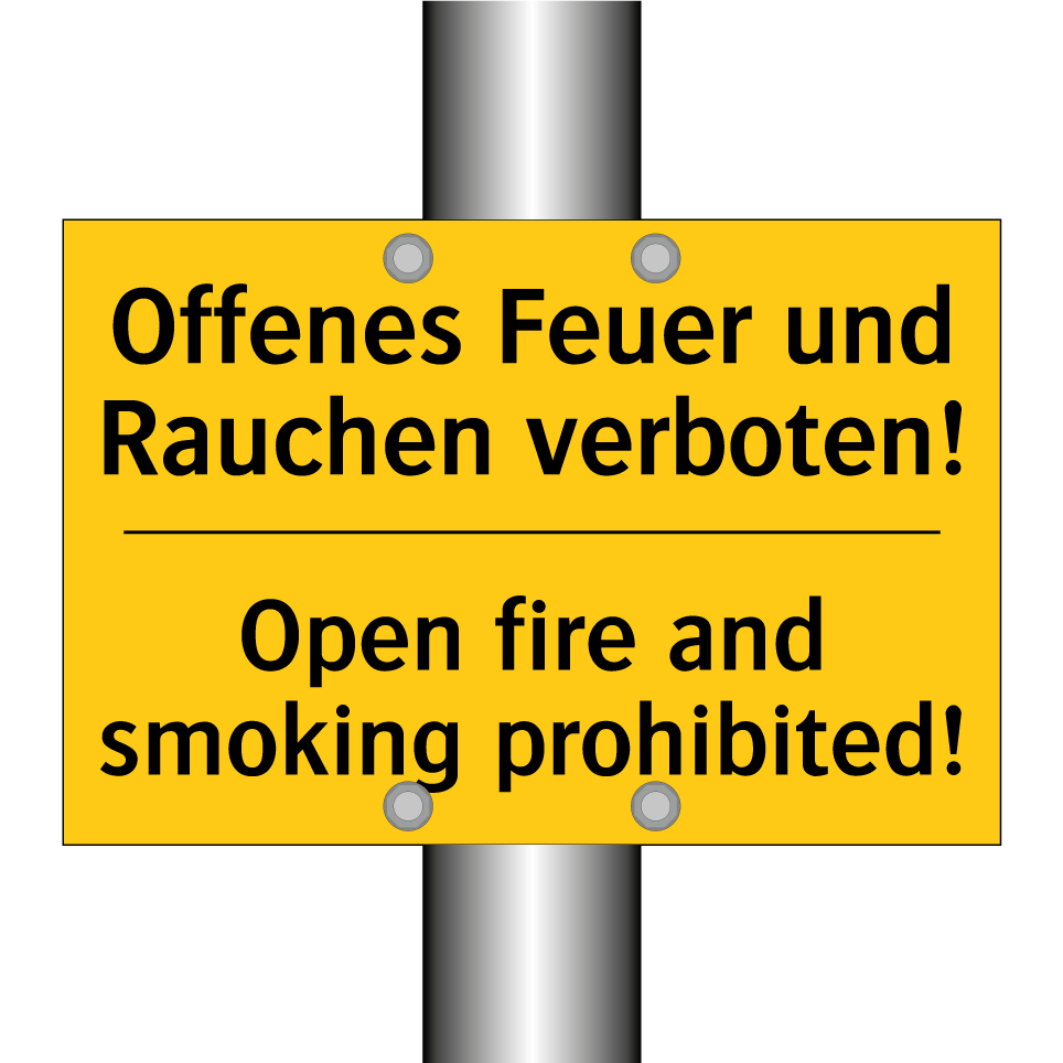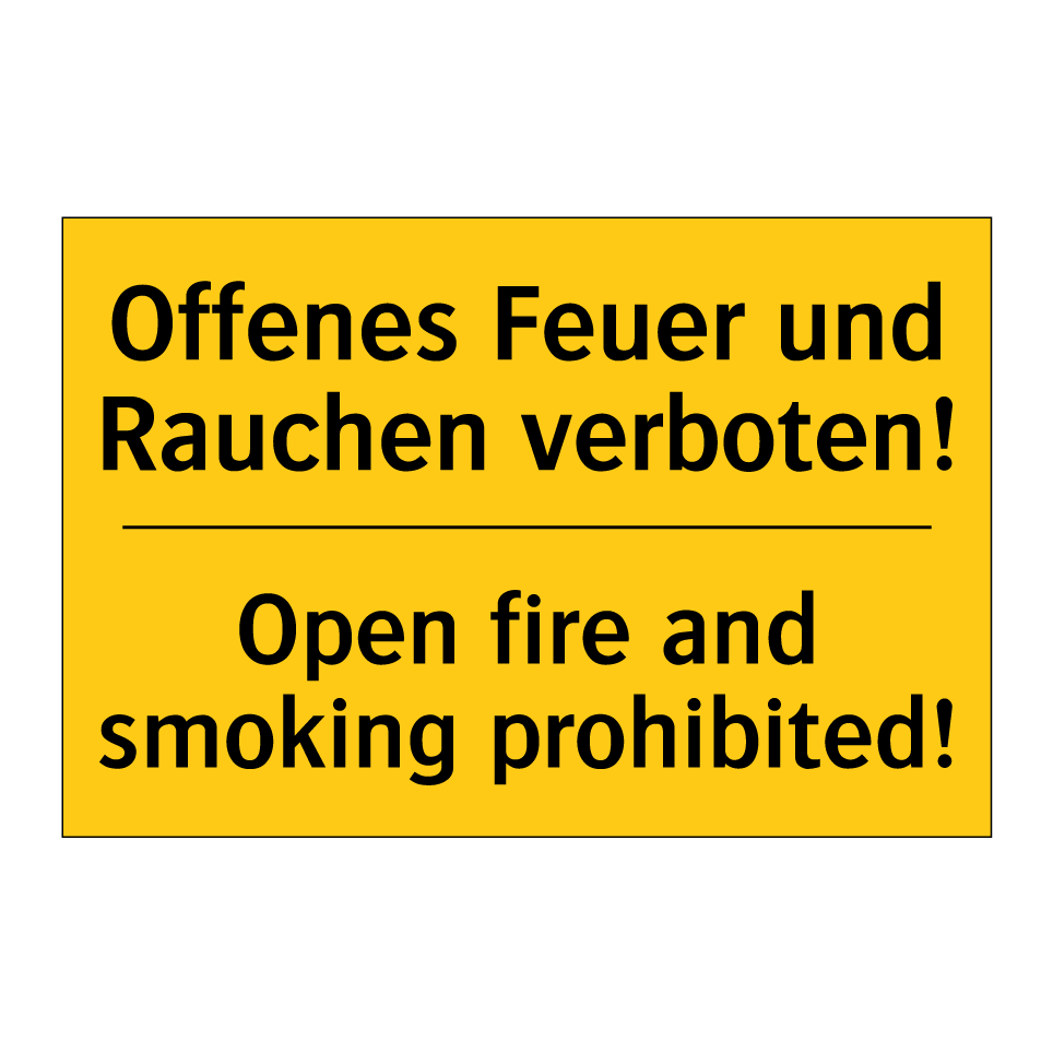 Zweisprachiges Warnschild mit deutschem Text Offenes Feuer und Rauchen verboten! und englischem Text Open fire and smoking prohibited!