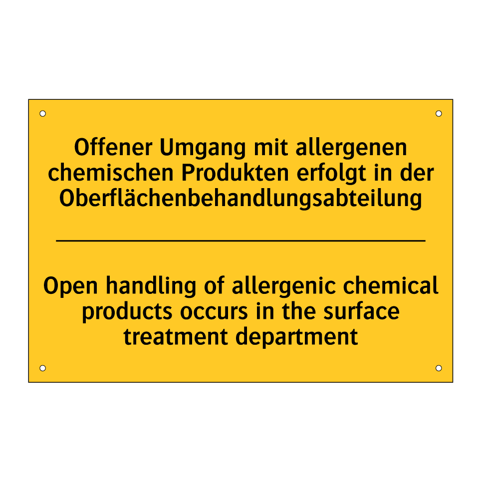 Zweisprachiges Warnschild mit deutschem Text Offener Umgang mit allergenen chemischen Produkten erfolgt in der Oberflächenbehandlungsabteilung und englischem Text Open handling of allergenic chemical products occurs in the surface treatment department