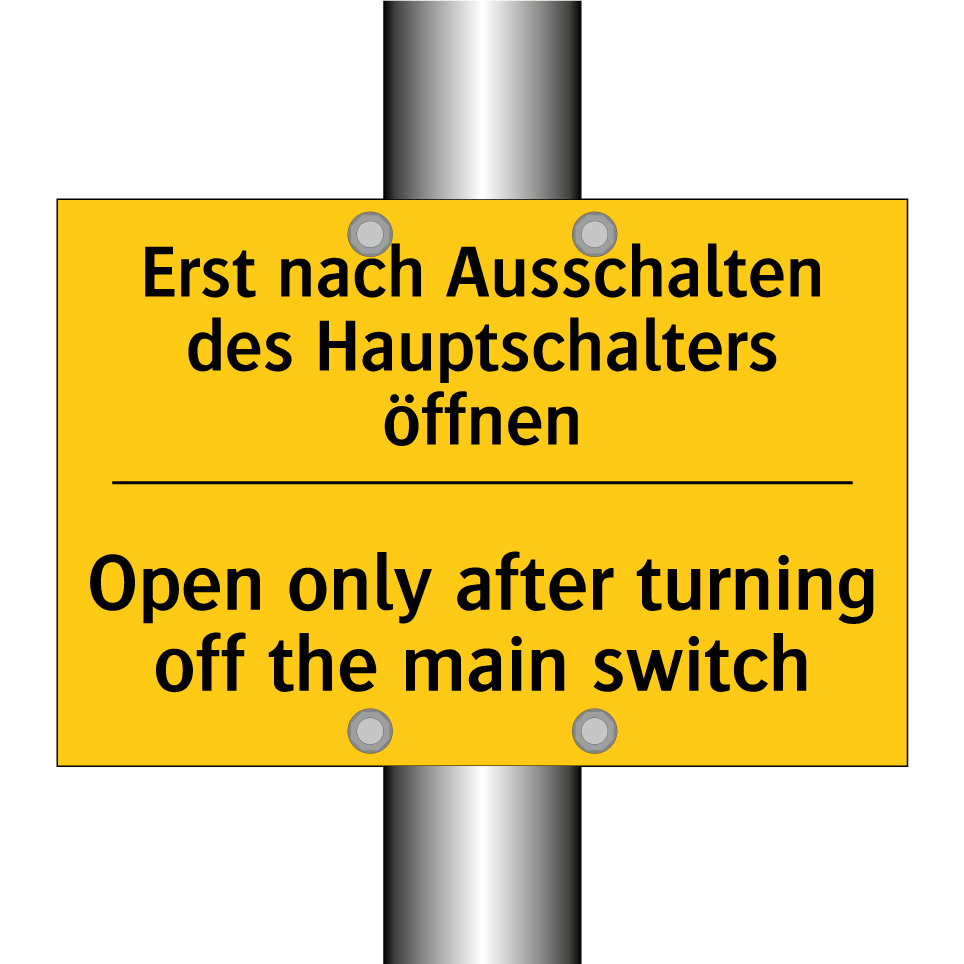 Zweisprachiges Warnschild mit deutschem Text Erst nach Ausschalten des Hauptschalters öffnen und englischem Text Open only after turning off the main switch