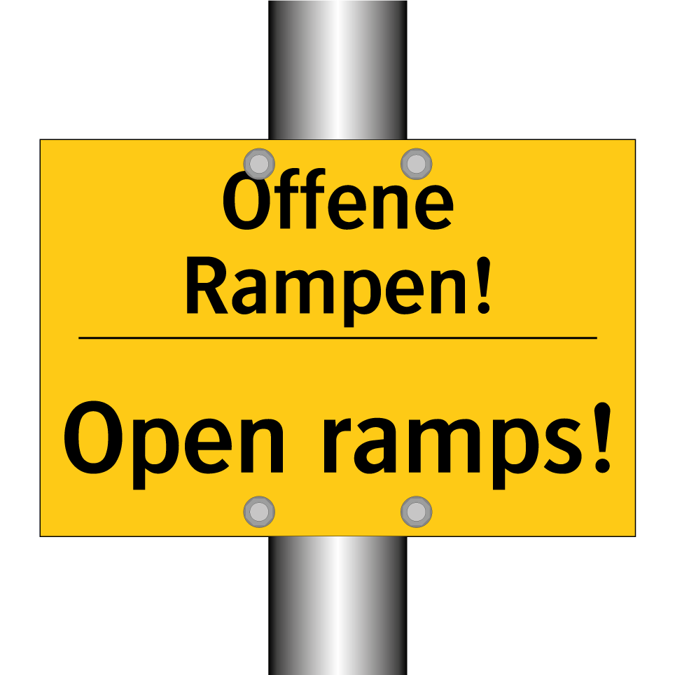 Zweisprachiges Warnschild mit deutschem Text Offene Rampen! und englischem Text Open ramps!