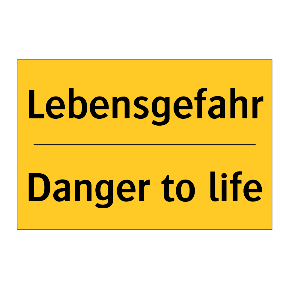Zweisprachiges Warnschild mit deutschem Text Lebensgefahr und englischem Text Danger to life