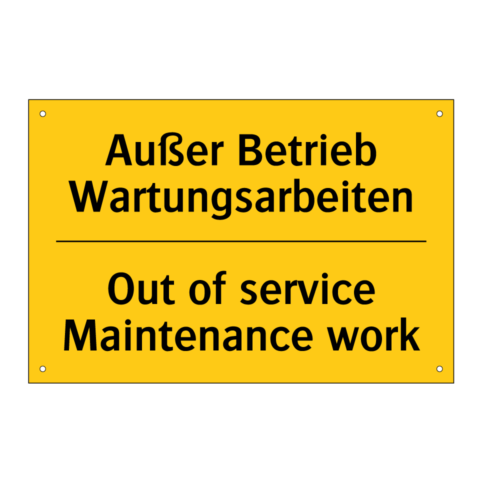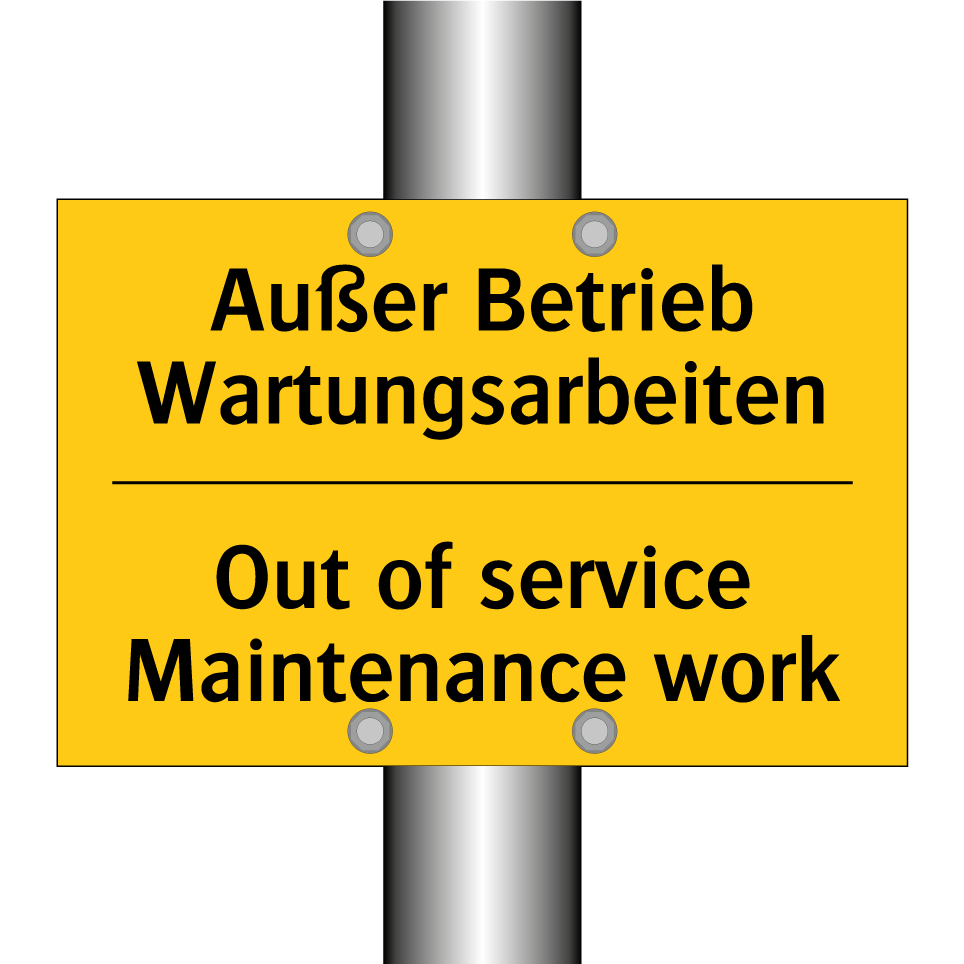 Zweisprachiges Warnschild mit deutschem Text Außer Betrieb Wartungsarbeiten und englischem Text Out of service Maintenance work