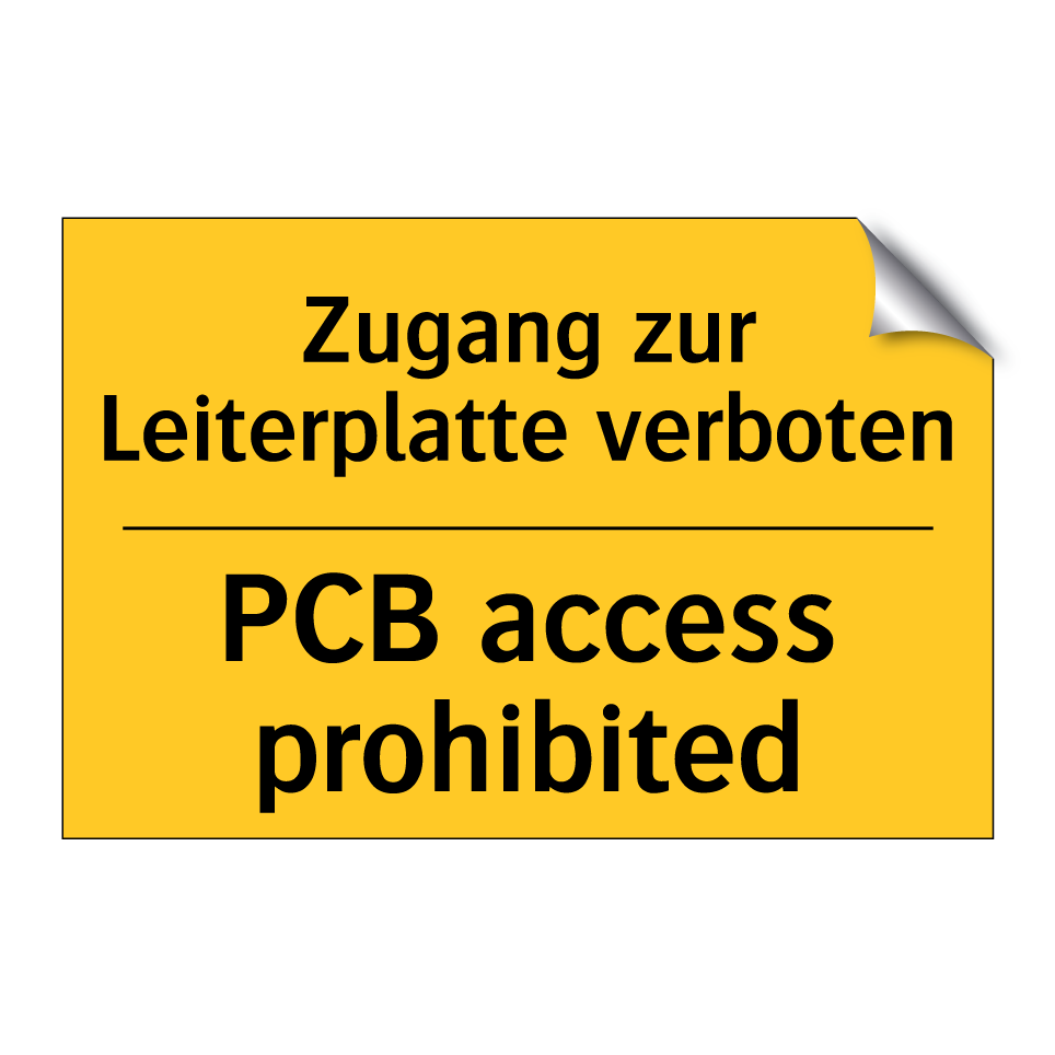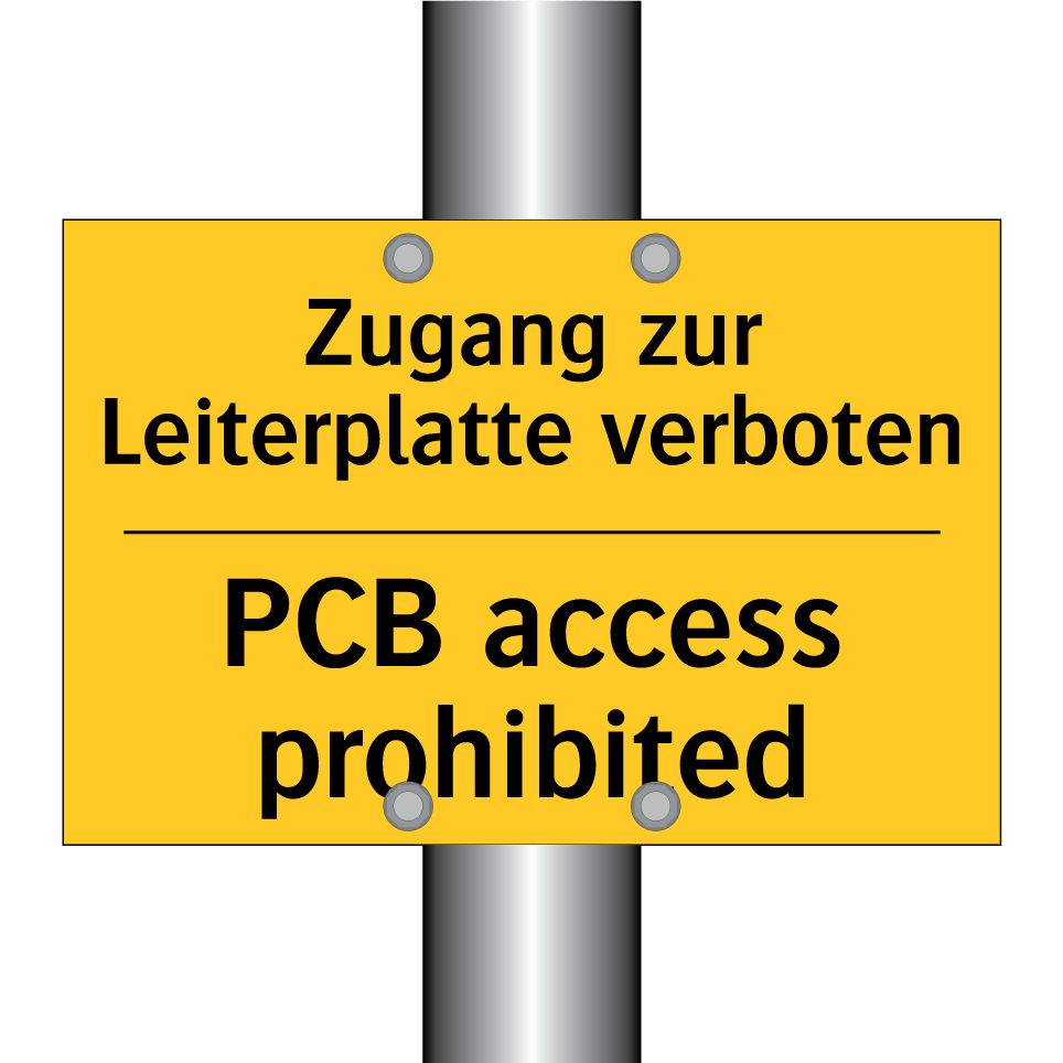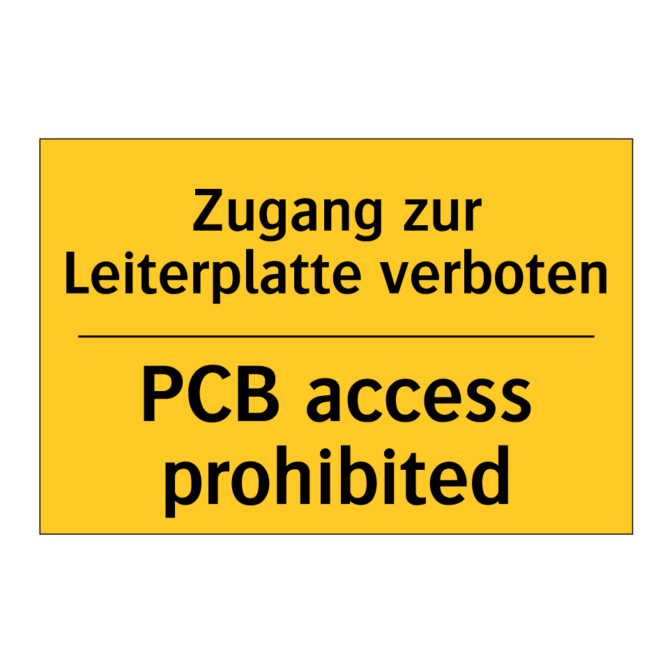 Zweisprachiges Warnschild mit deutschem Text Zugang zur Leiterplatte verboten und englischem Text PCB access prohibited