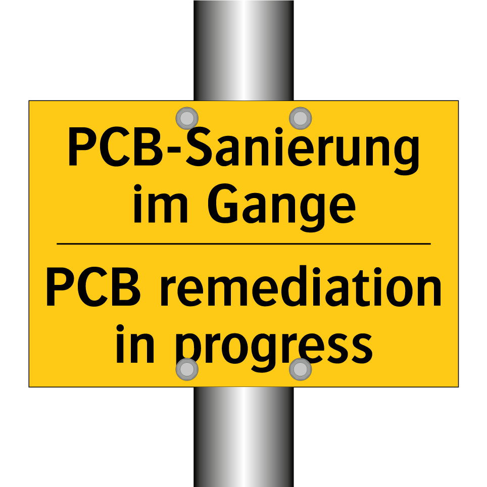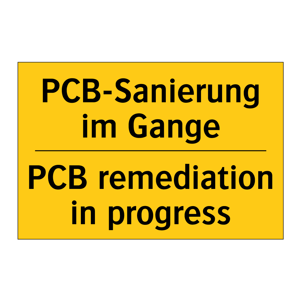 Zweisprachiges Warnschild mit deutschem Text PCB-Sanierung im Gange und englischem Text PCB remediation in progress