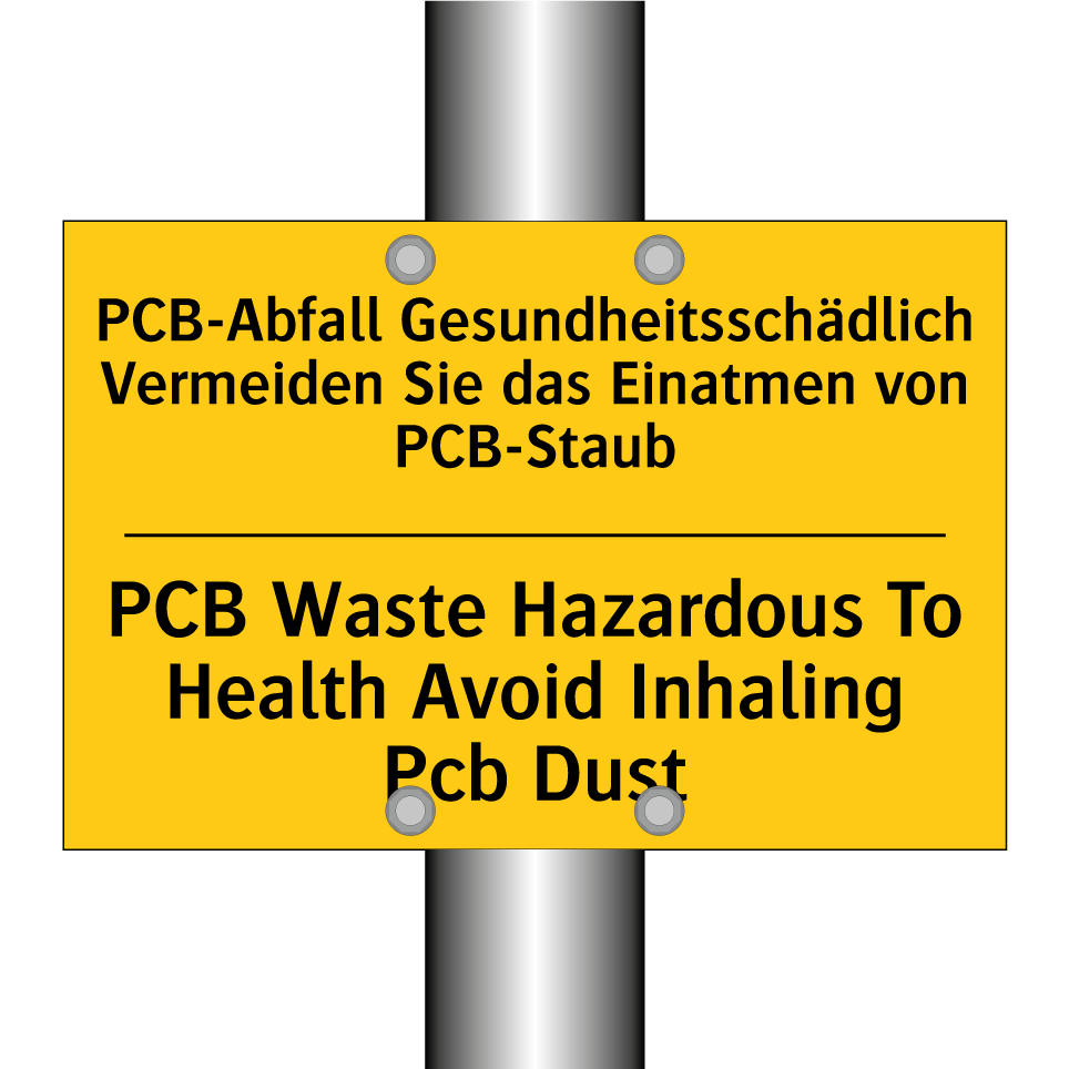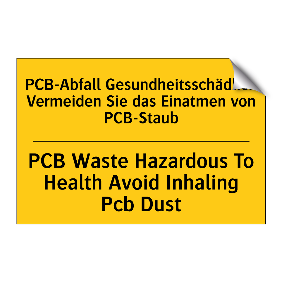 Zweisprachiges Warnschild mit deutschem Text PCB-Abfall Gesundheitsschädlich Vermeiden Sie das Einatmen von PCB-Staub und englischem Text PCB Waste Hazardous To Health Avoid Inhaling Pcb Dust