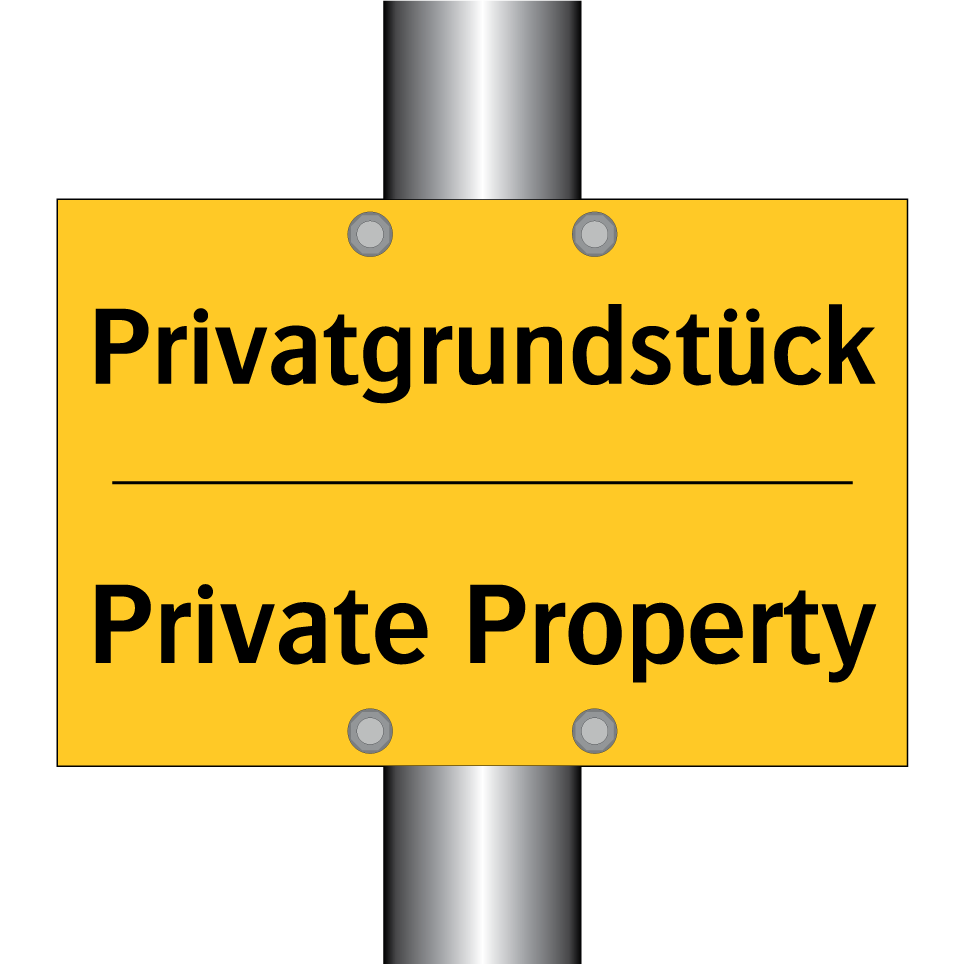 Zweisprachiges Warnschild mit deutschem Text Privatgrundstück und englischem Text Private Property