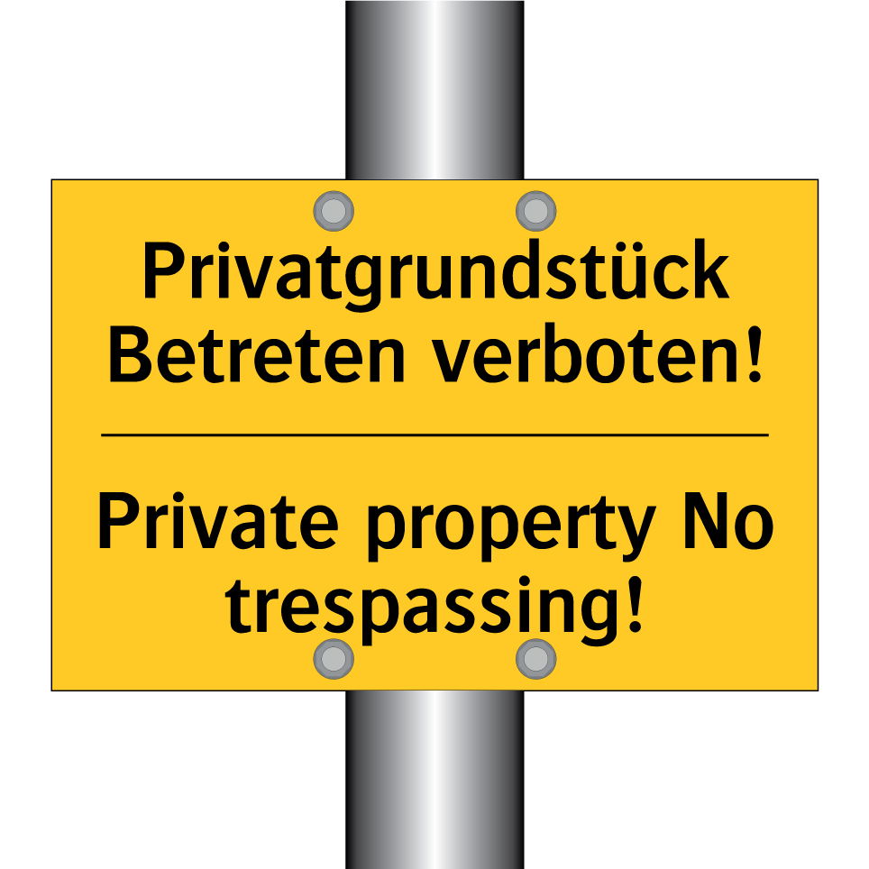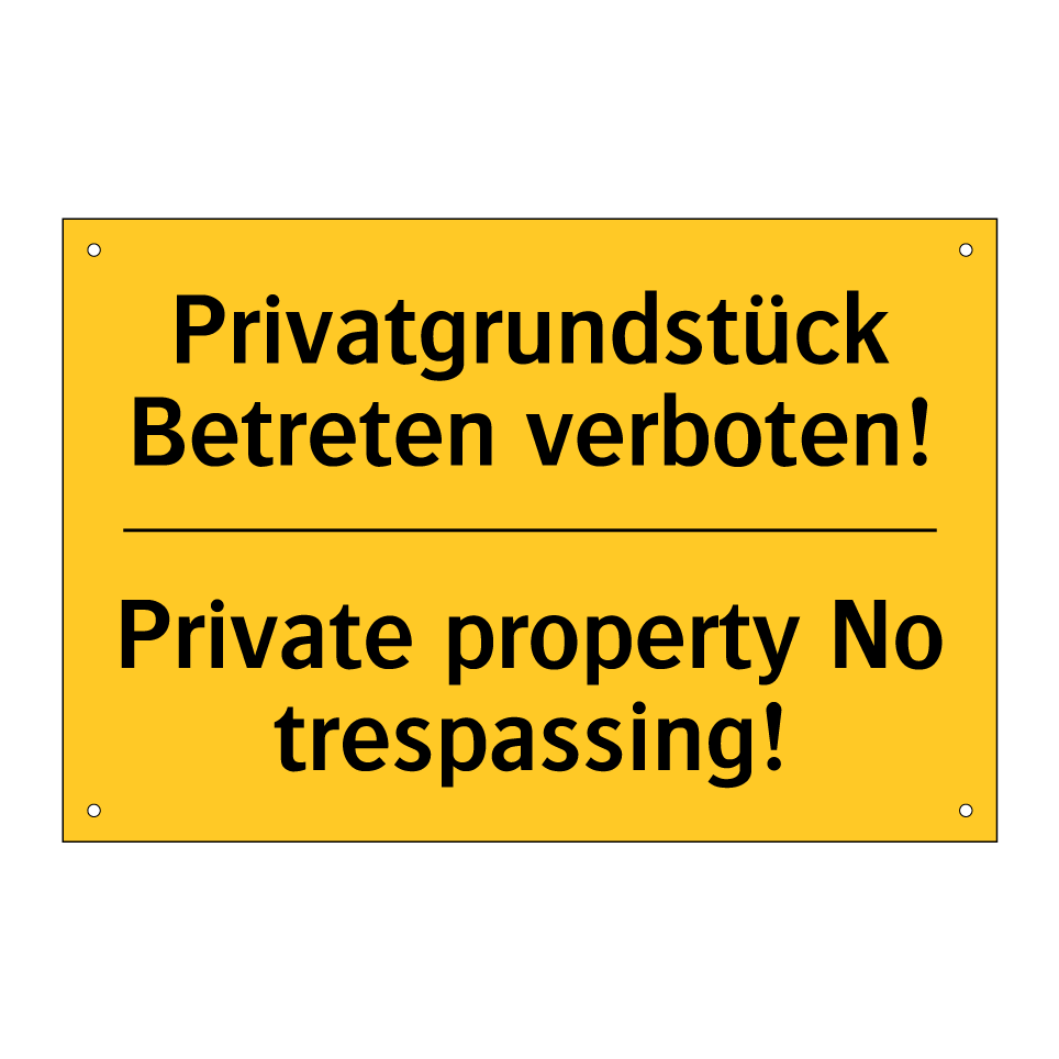 Zweisprachiges Warnschild mit deutschem Text Privatgrundstück Betreten verboten! und englischem Text Private property No trespassing!