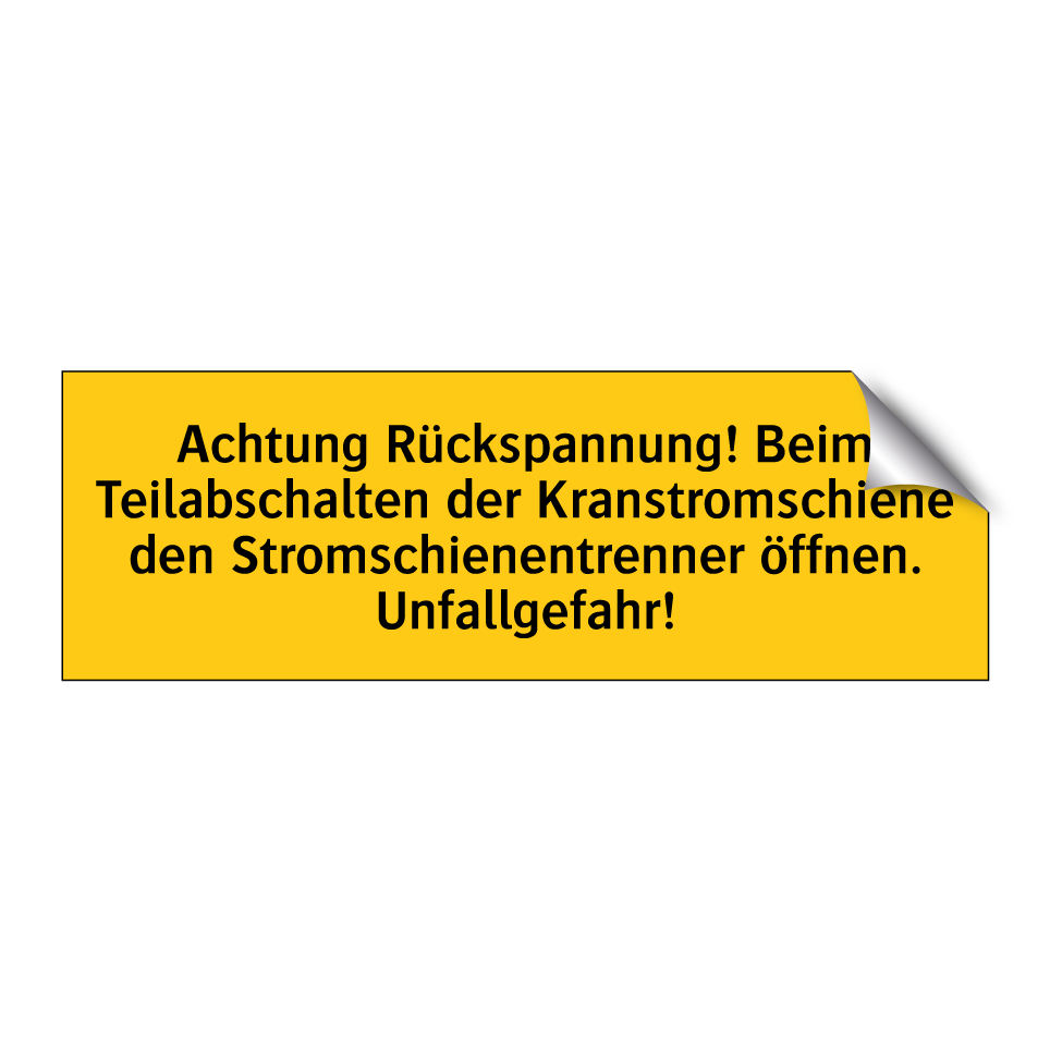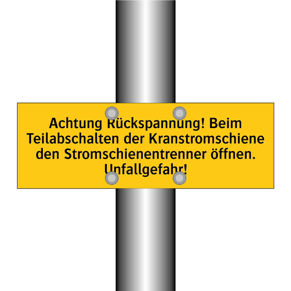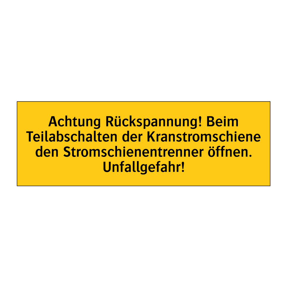 Warnschild mit dem Text Achtung Rückspannung! Beim Teilabschalten der Kranstromschiene den Stromschienentrenner öffnen. Unfallgefahr!
