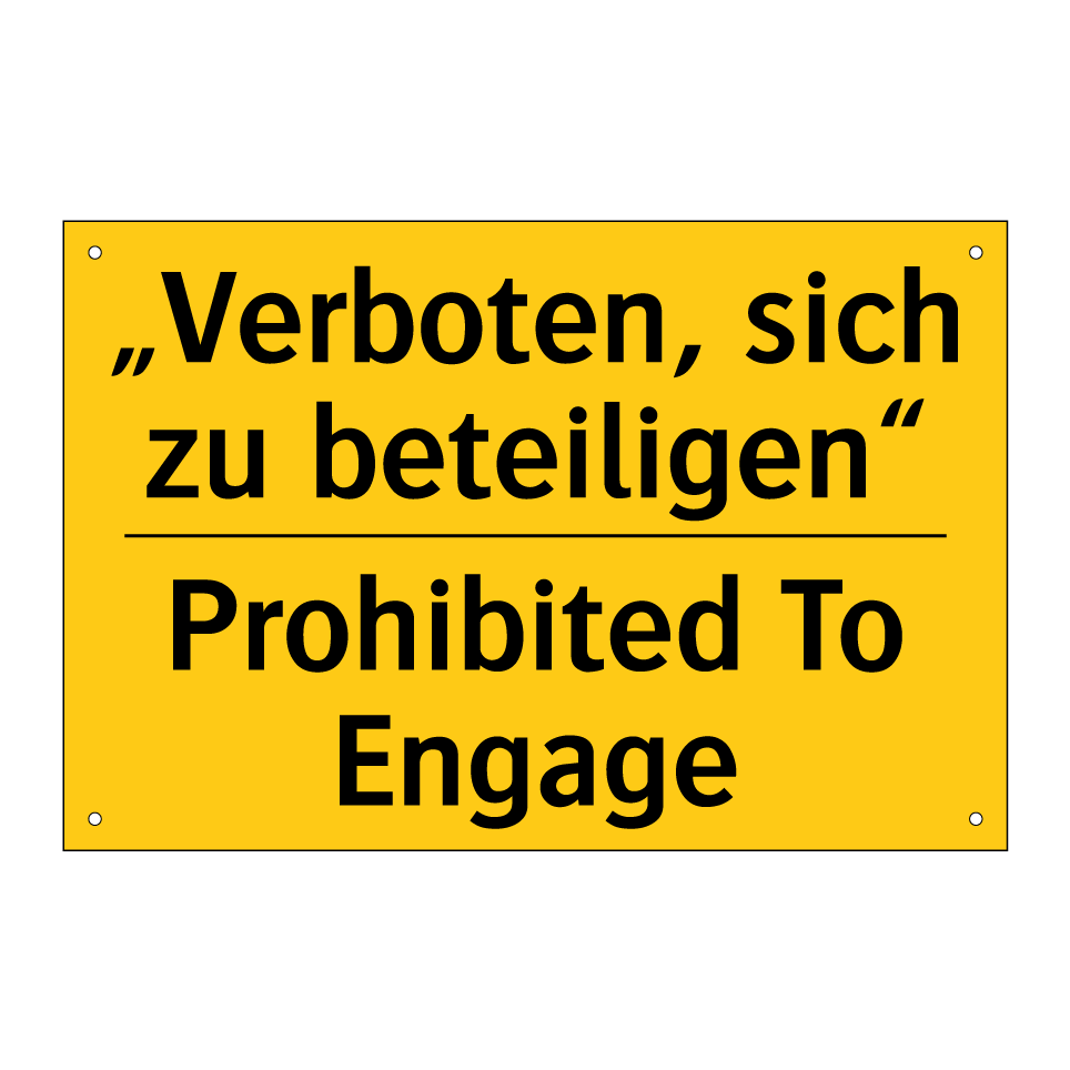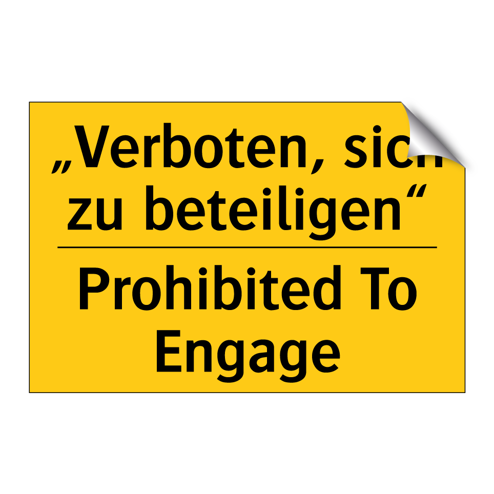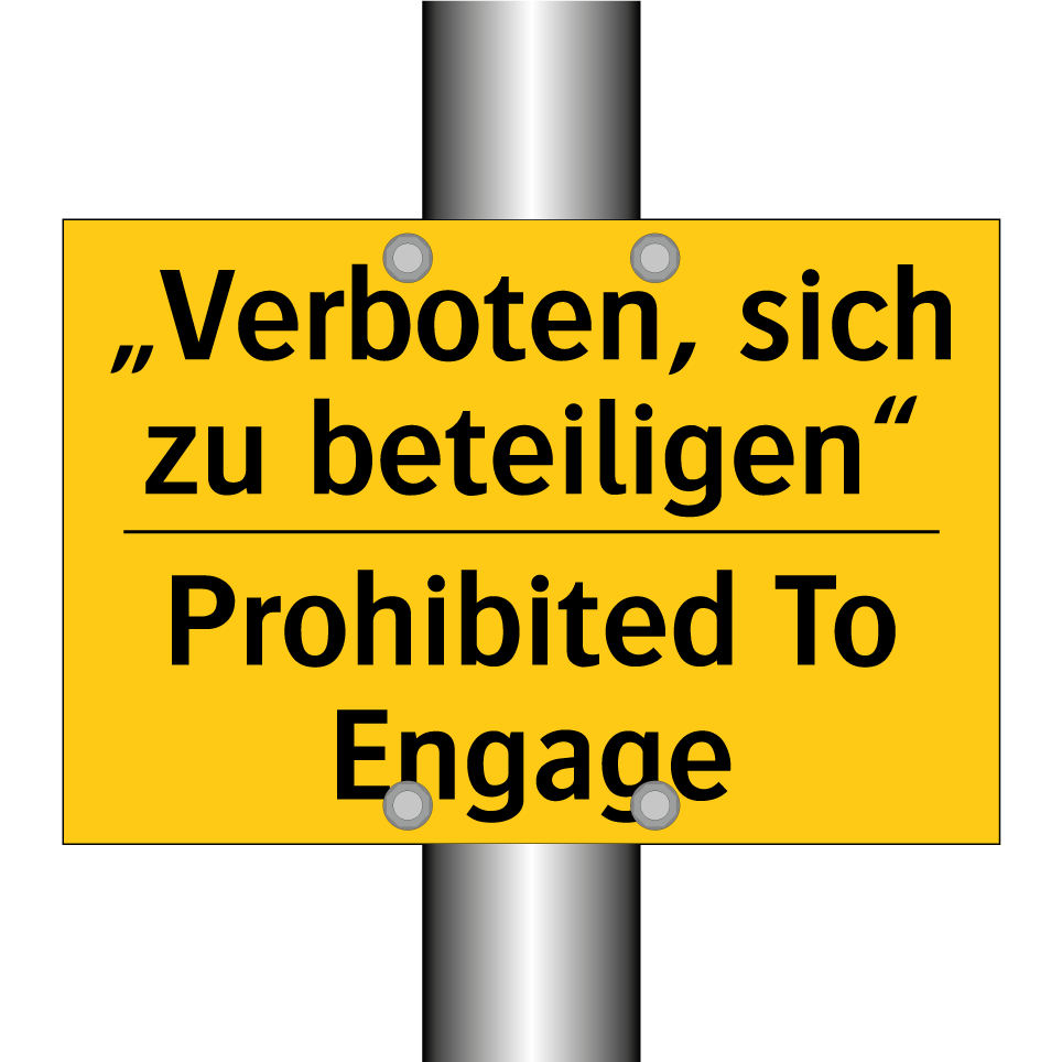 Zweisprachiges Warnschild mit deutschem Text „Verboten, sich zu beteiligen“ und englischem Text Prohibited To Engage