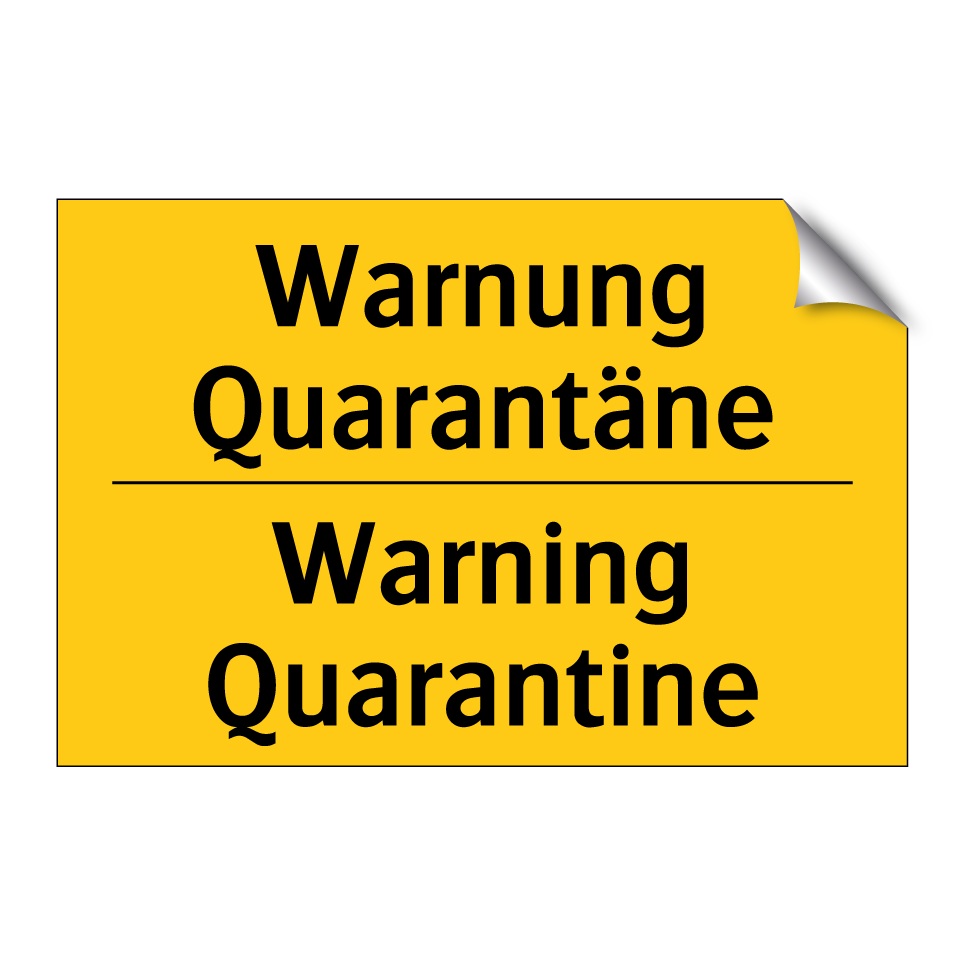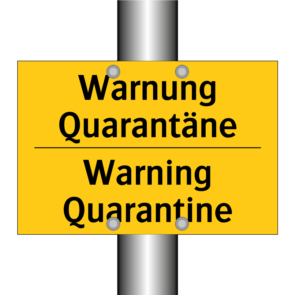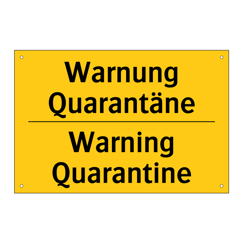 Zweisprachiges Warnschild mit deutschem Text Warnung Quarantäne und englischem Text Warning Quarantine