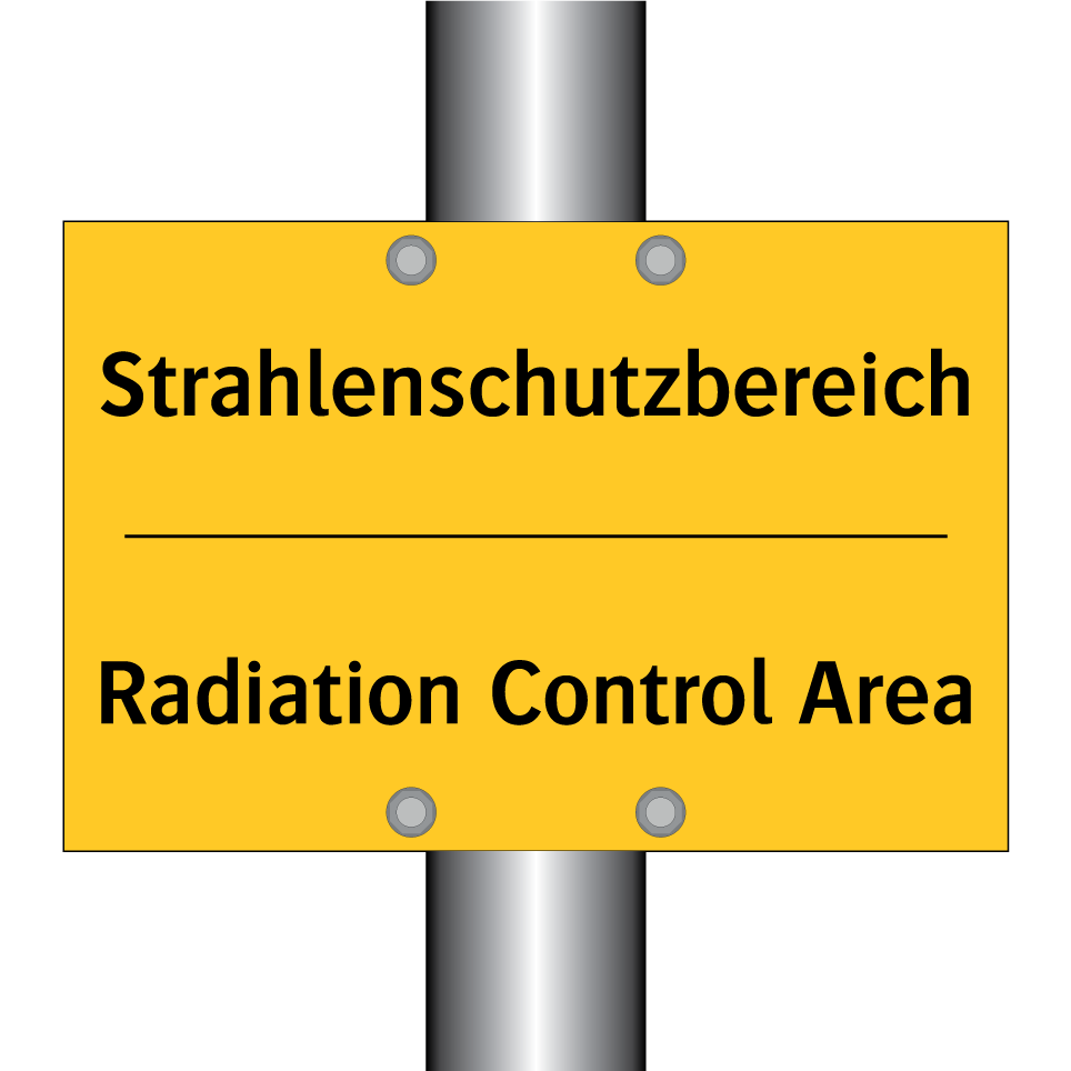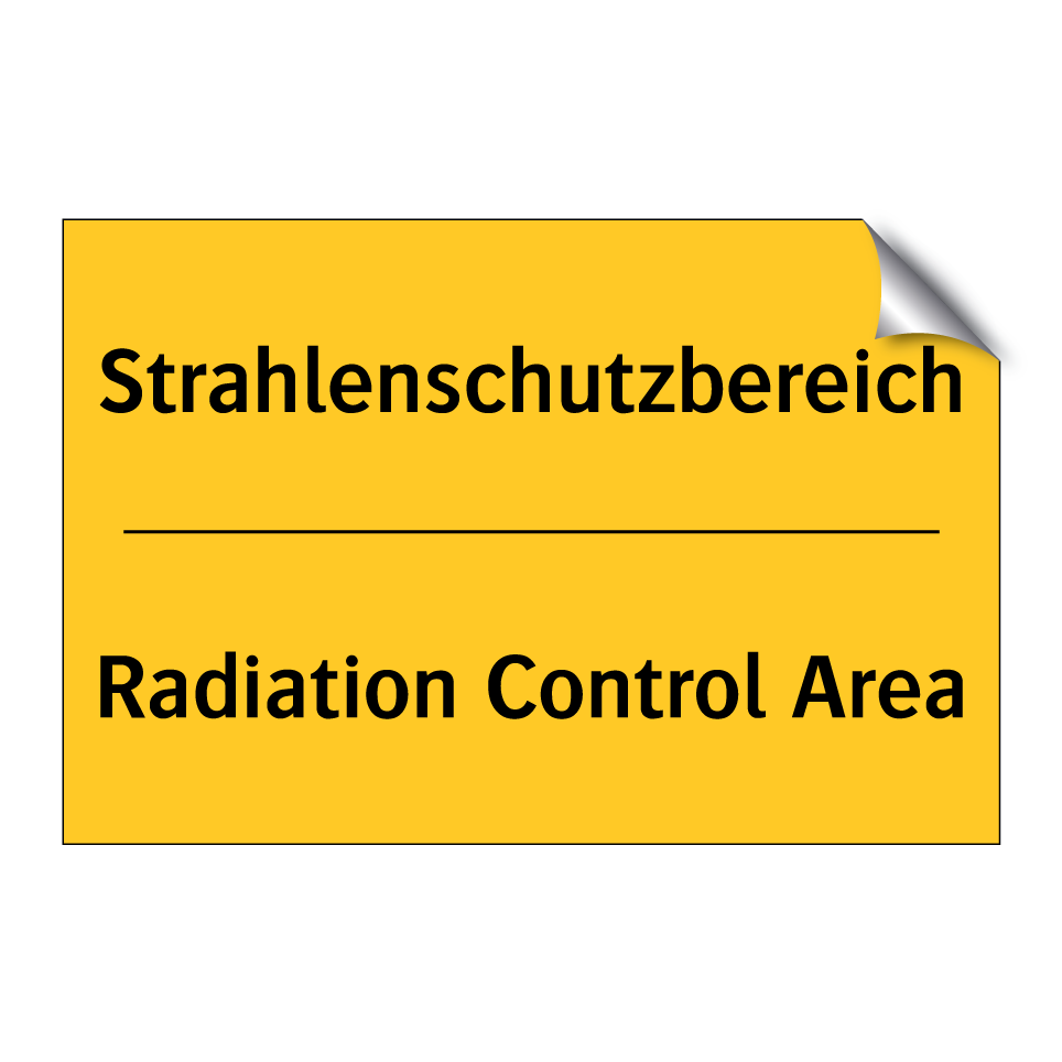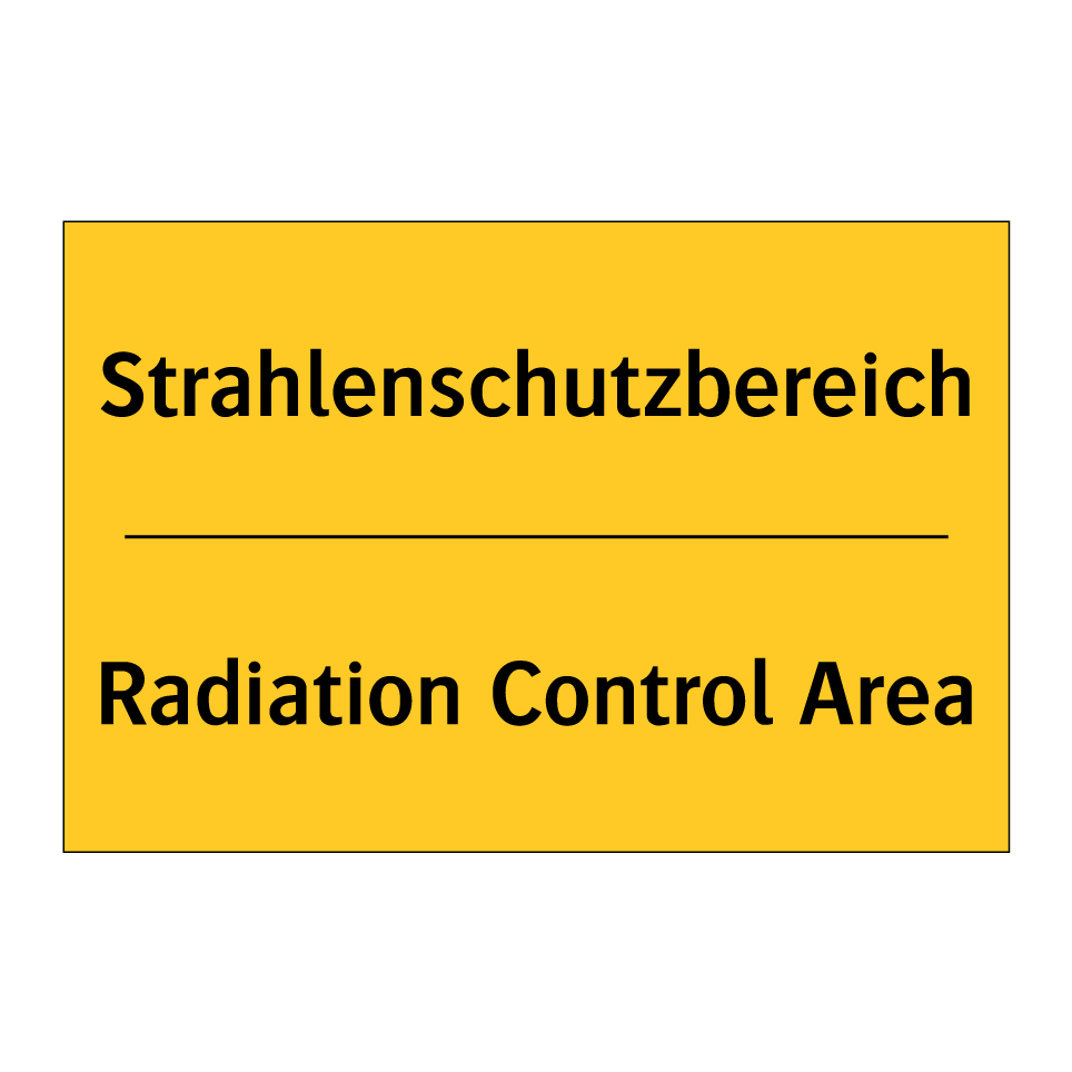 Zweisprachiges Warnschild mit deutschem Text Strahlenschutzbereich und englischem Text Radiation Control Area