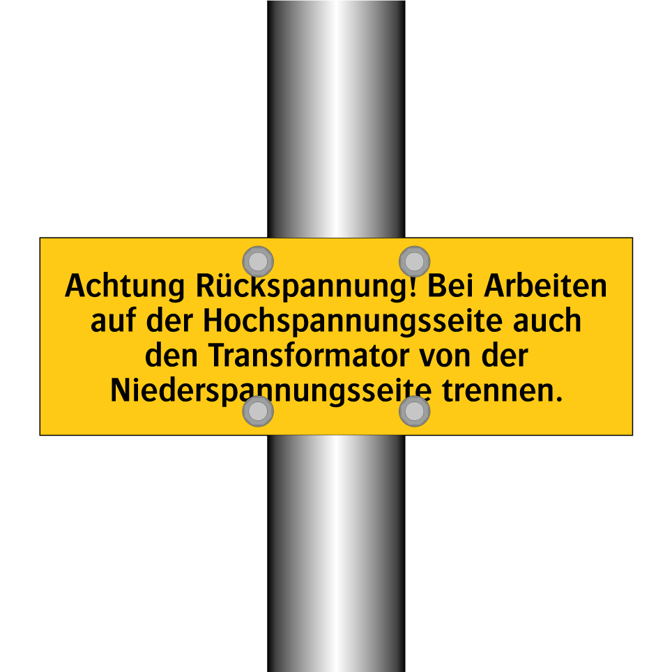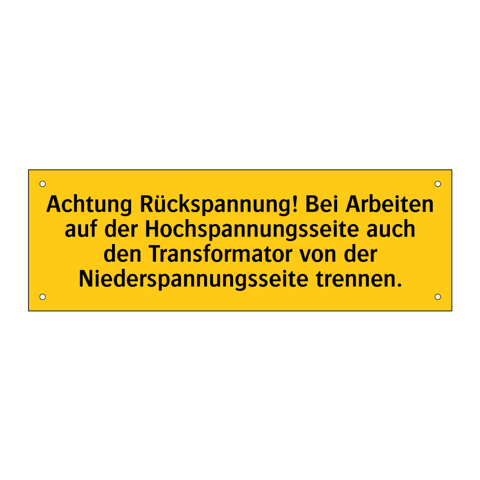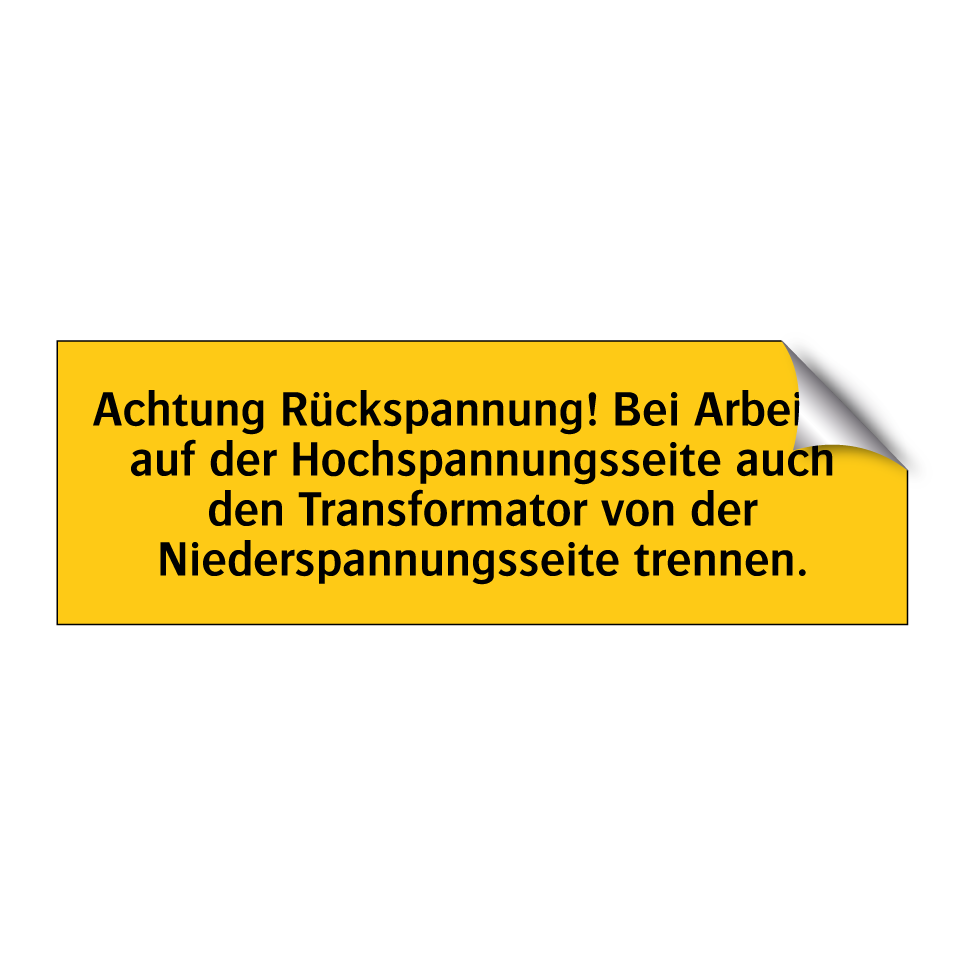 Warnschild mit dem Text Achtung Rückspannung! Bei Arbeiten auf der Hochspannungsseite auch den Transformator von der Niederspannungsseite trennen.