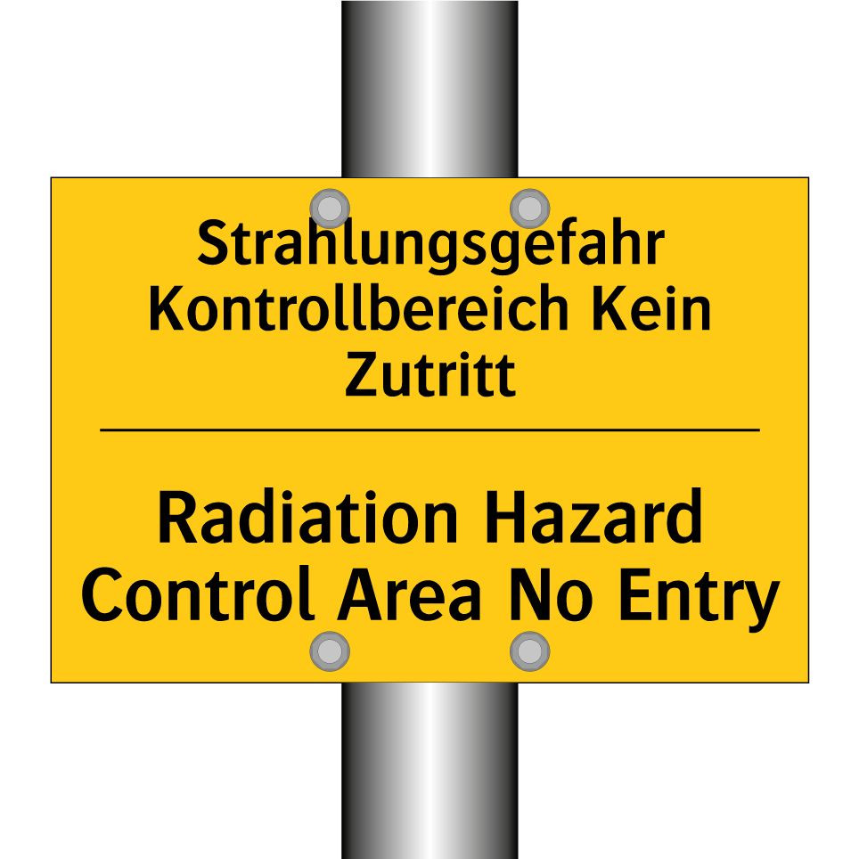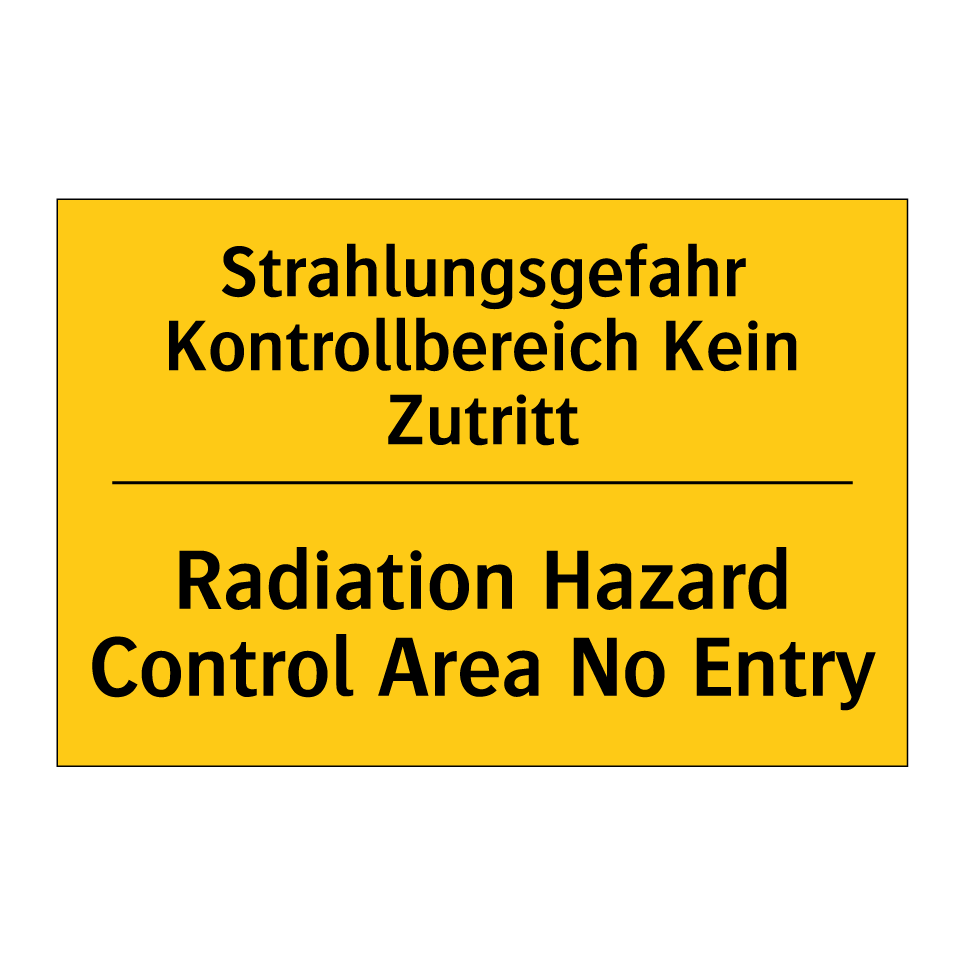 Zweisprachiges Warnschild mit deutschem Text Strahlungsgefahr Kontrollbereich Kein Zutritt und englischem Text Radiation Hazard Control Area No Entry