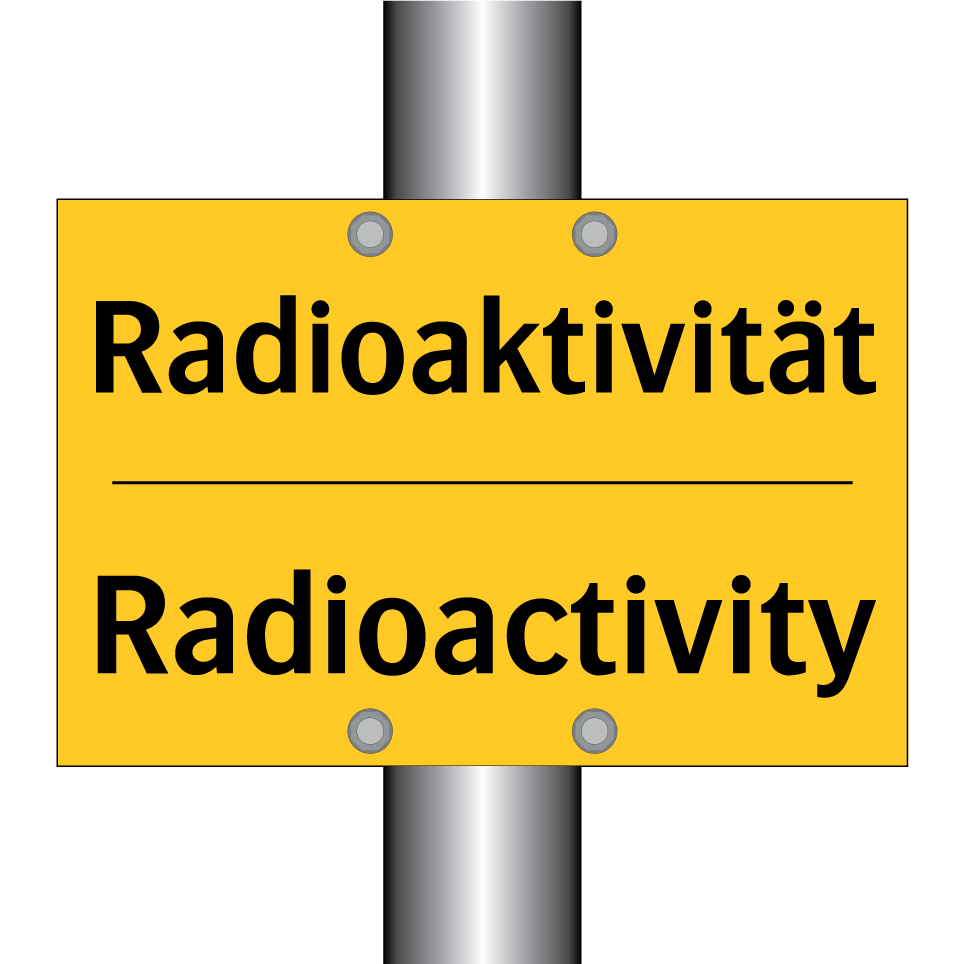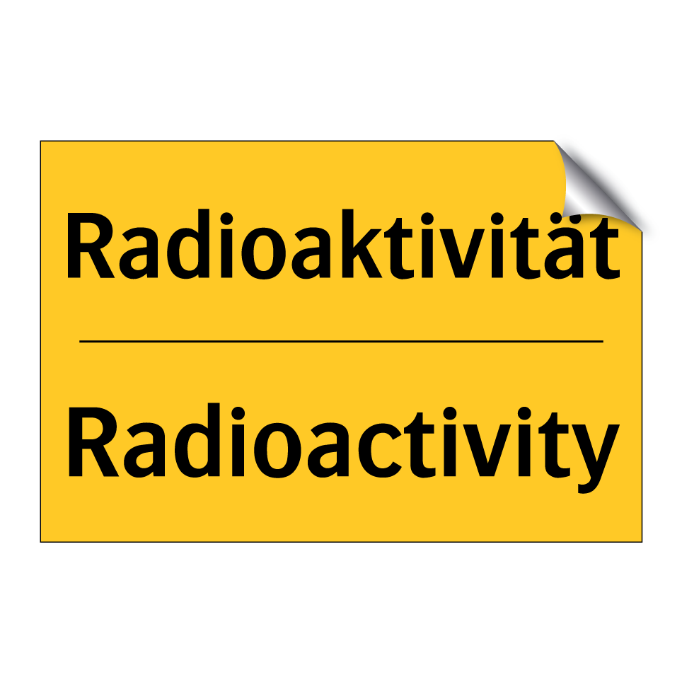 Zweisprachiges Warnschild mit deutschem Text Radioaktivität und englischem Text Radioactivity