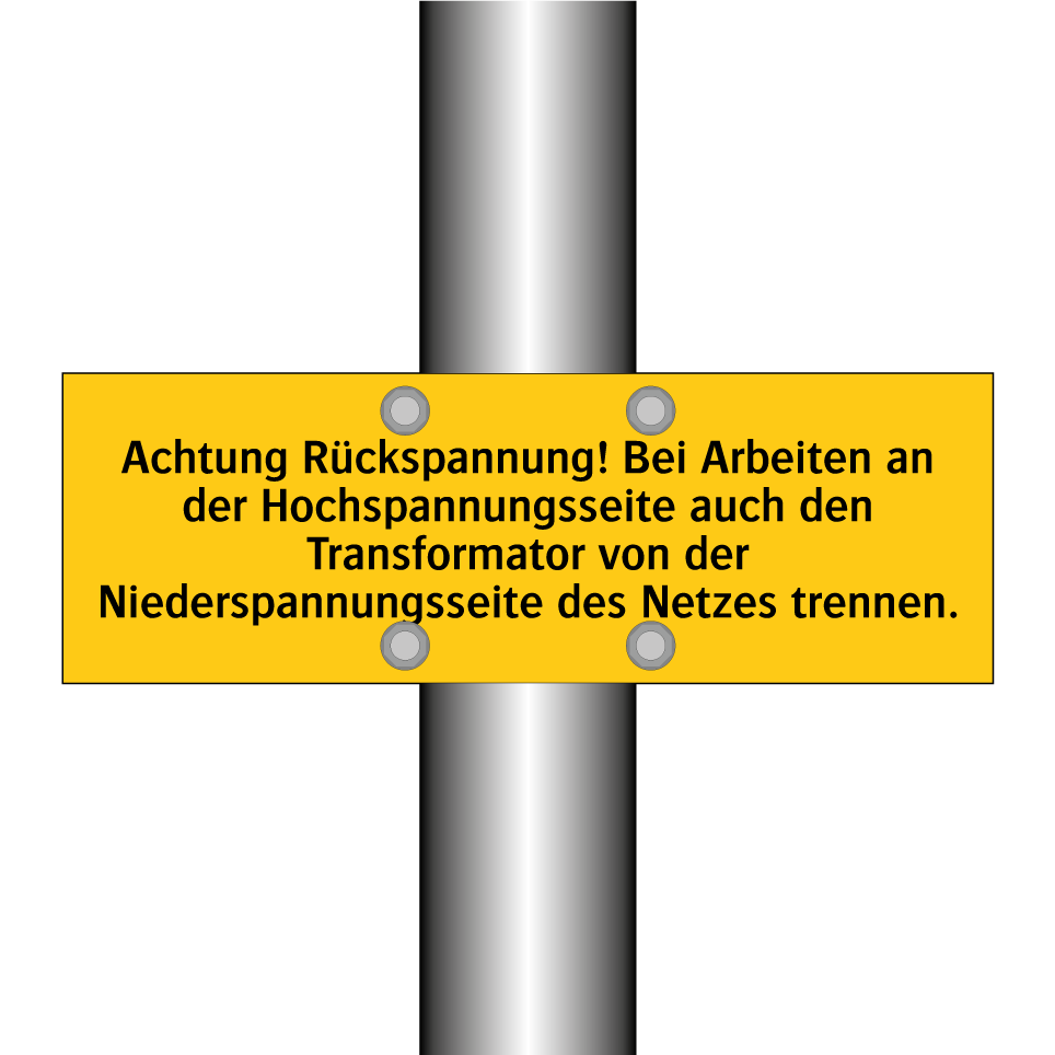 Warnschild mit dem Text Achtung Rückspannung! Bei Arbeiten an der Hochspannungsseite auch den Transformator von der Niederspannungsseite des Netzes trennen.
