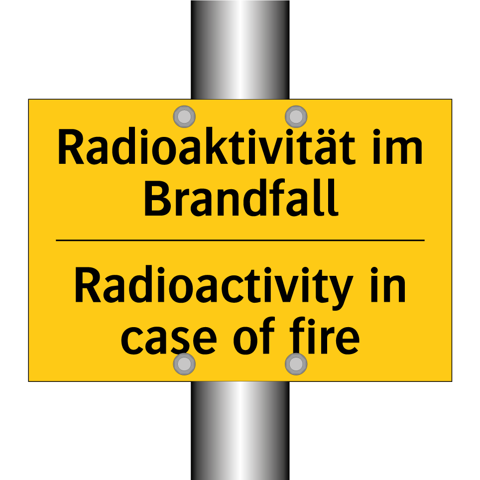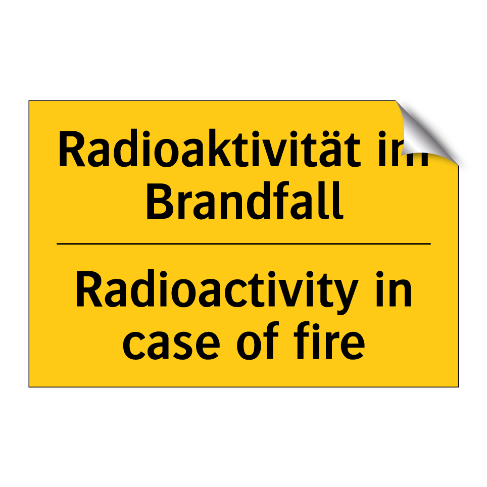 Zweisprachiges Warnschild mit deutschem Text Radioaktivität im Brandfall und englischem Text Radioactivity in case of fire