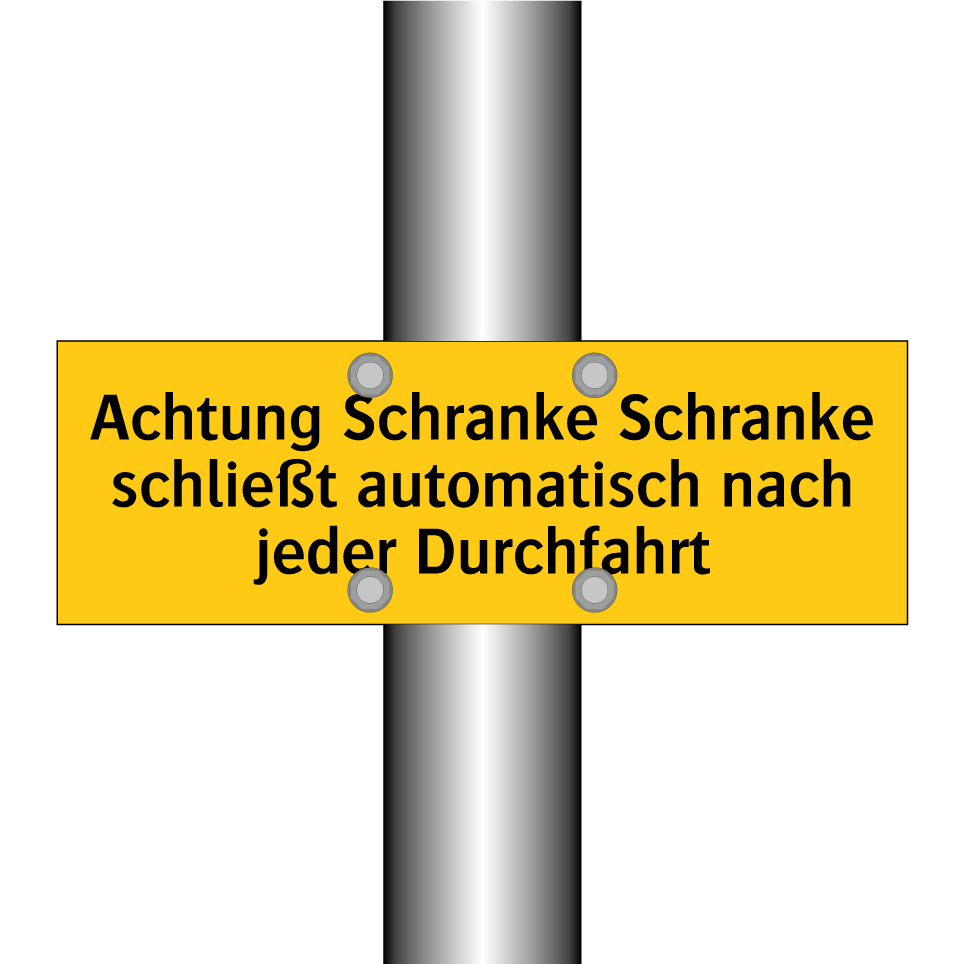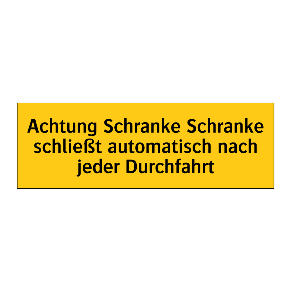 Warnschild mit dem Text Achtung Schranke Schranke schließt automatisch nach jeder Durchfahrt