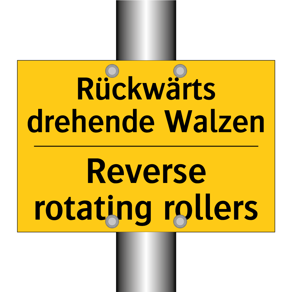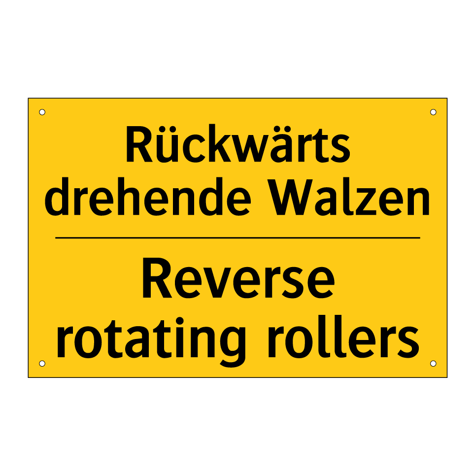 Zweisprachiges Warnschild mit deutschem Text Rückwärts drehende Walzen und englischem Text Reverse rotating rollers