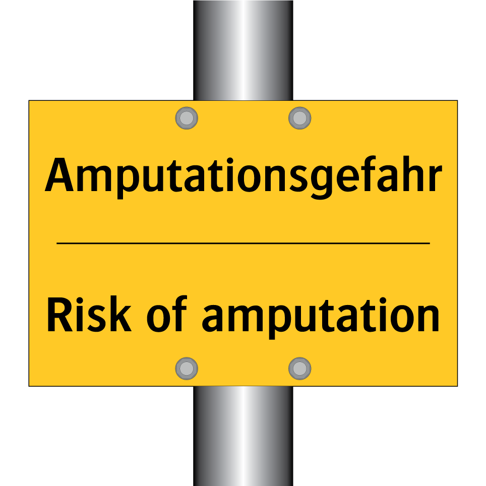 Zweisprachiges Warnschild mit deutschem Text Amputationsgefahr und englischem Text Risk of amputation