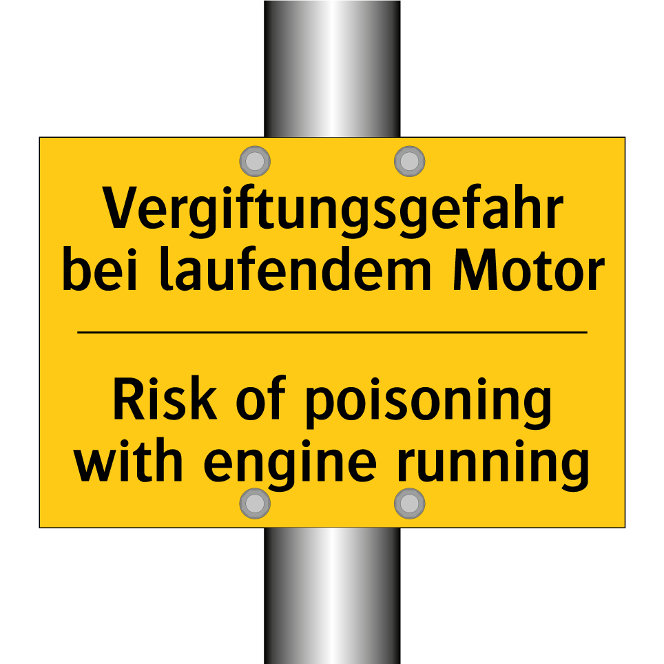 Zweisprachiges Warnschild mit deutschem Text Vergiftungsgefahr bei laufendem Motor und englischem Text Risk of poisoning with engine running