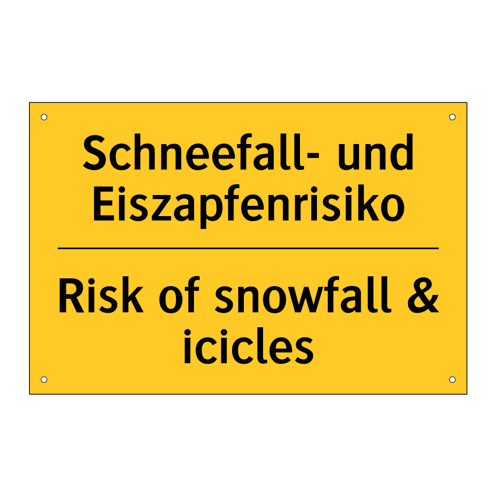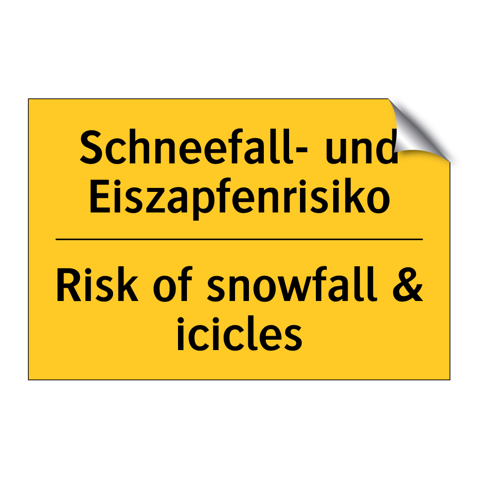 Zweisprachiges Warnschild mit deutschem Text Schneefall- und Eiszapfenrisiko und englischem Text Risk of snowfall & icicles
