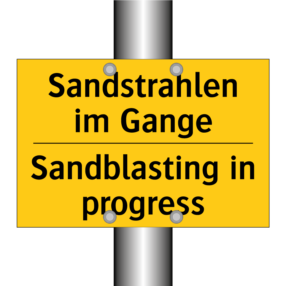 Zweisprachiges Warnschild mit deutschem Text Sandstrahlen im Gange und englischem Text Sandblasting in progress