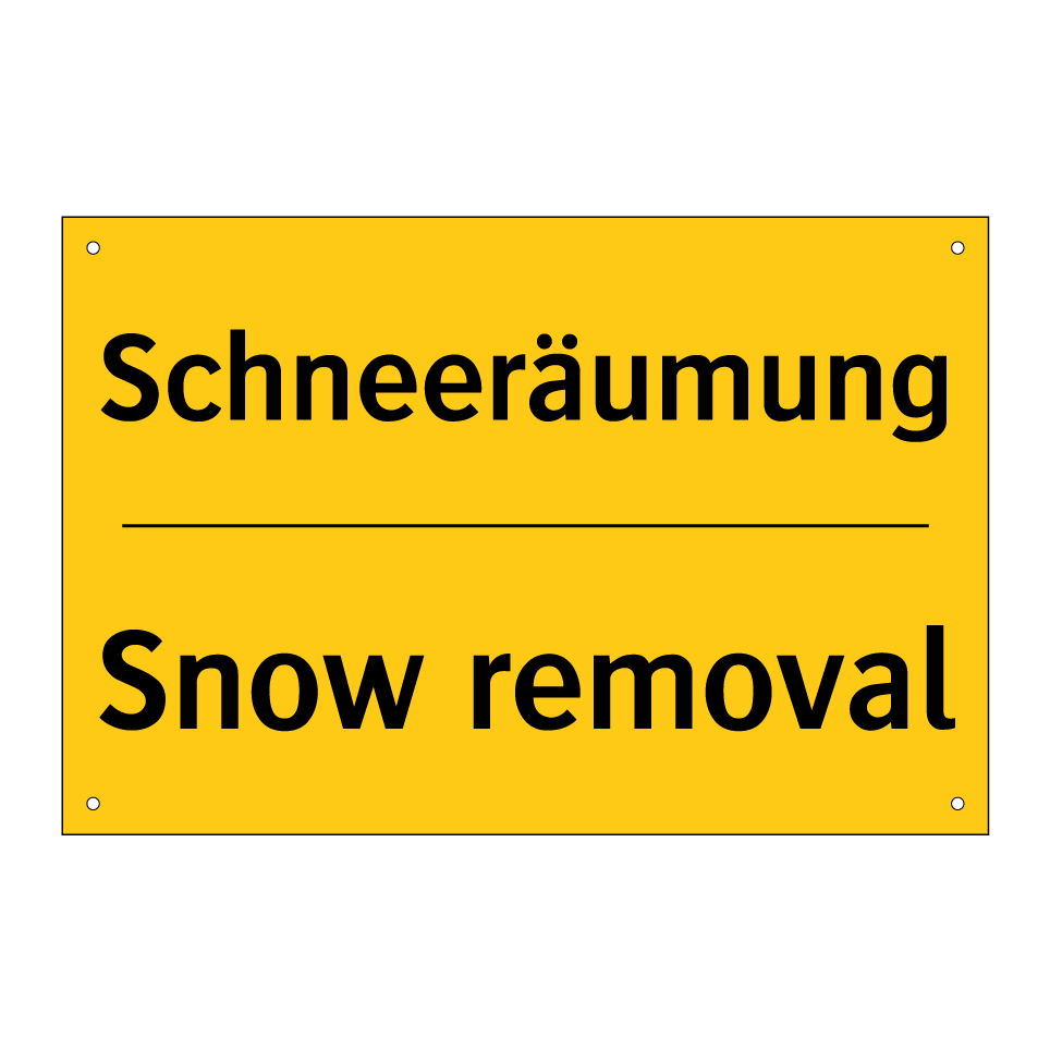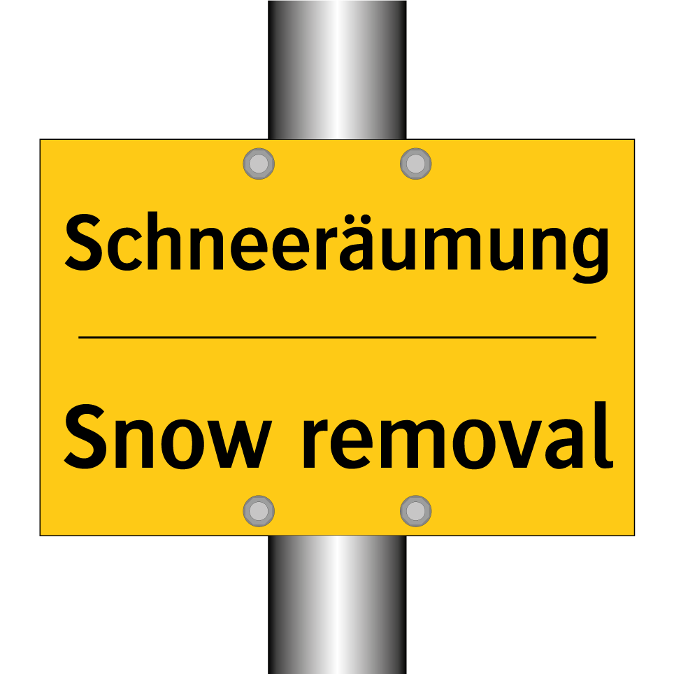 Zweisprachiges Warnschild mit deutschem Text Schneeräumung und englischem Text Snow removal
