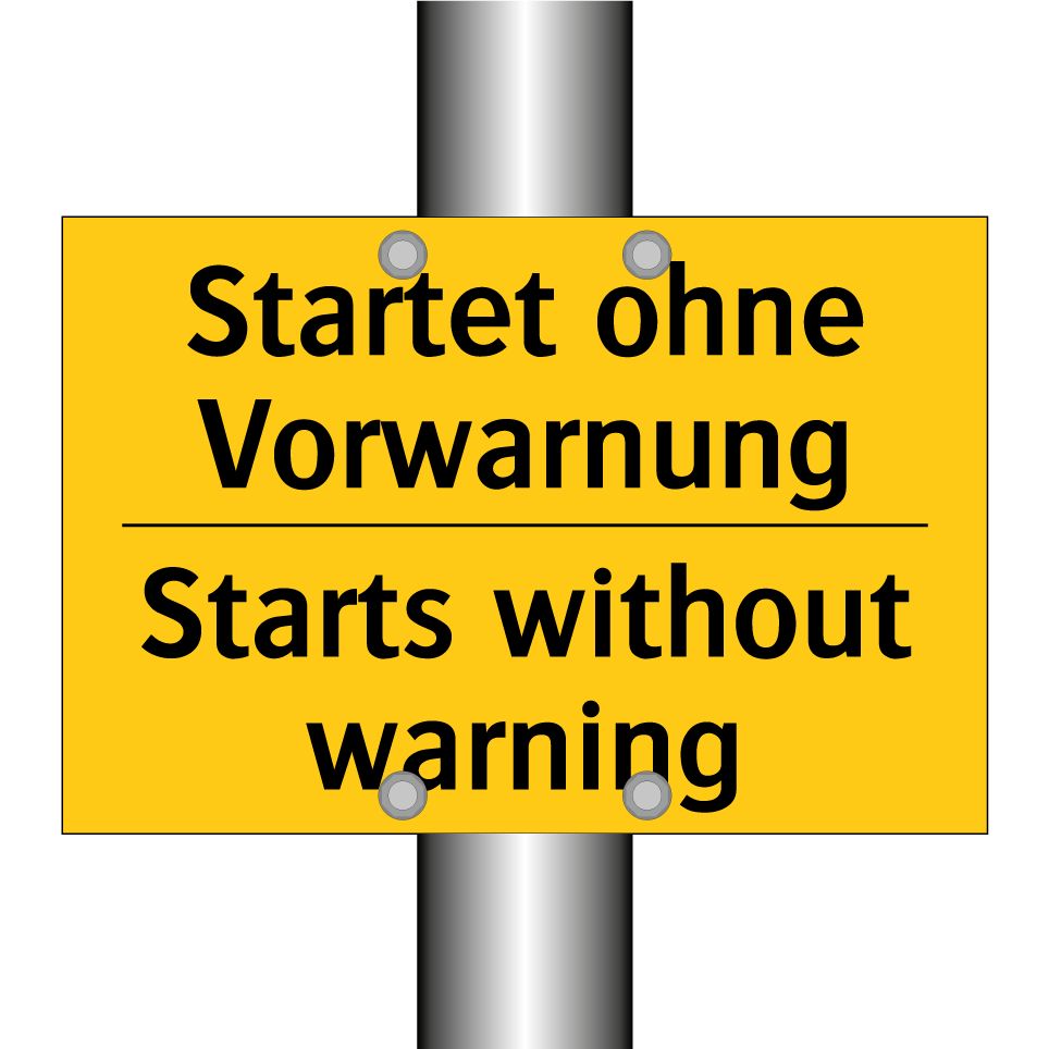 Zweisprachiges Warnschild mit deutschem Text Startet ohne Vorwarnung und englischem Text Starts without warning