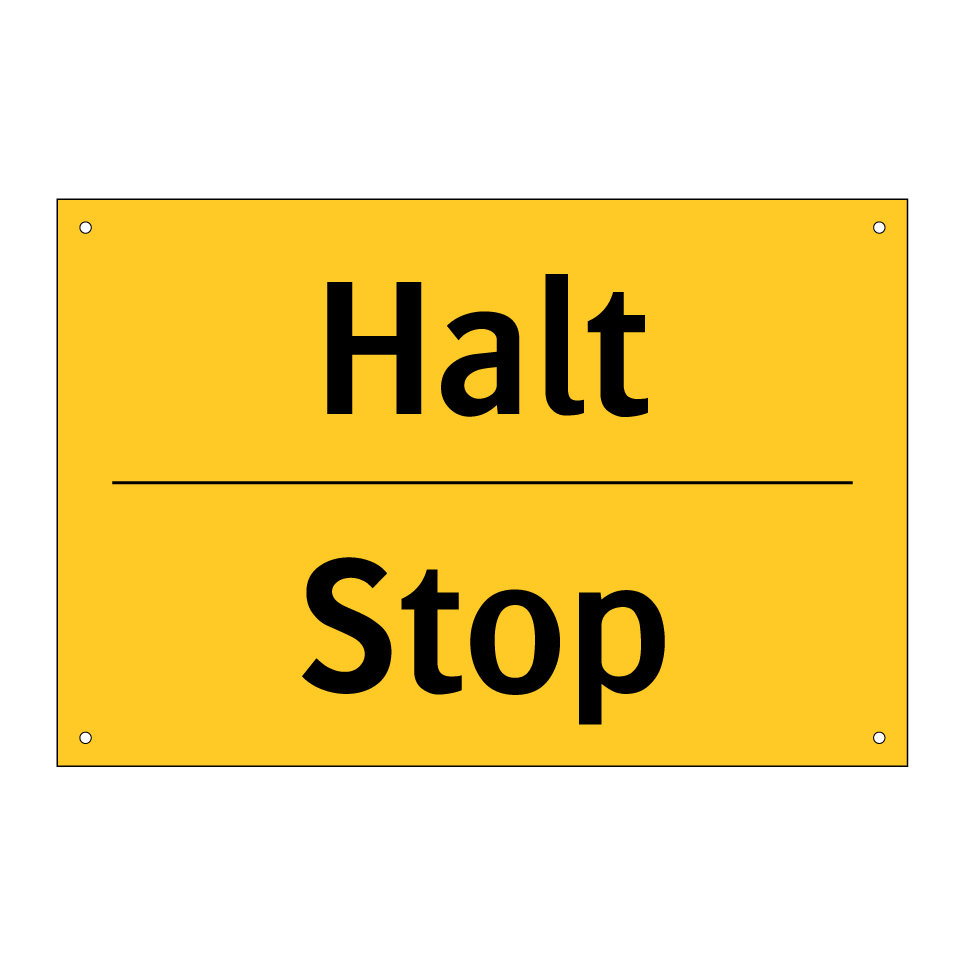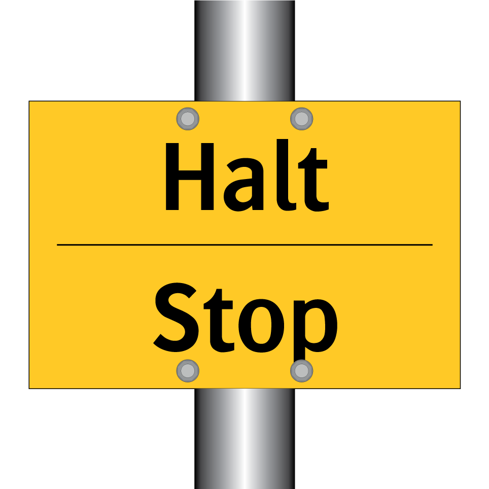 Zweisprachiges Warnschild mit deutschem Text Halt und englischem Text Stop
