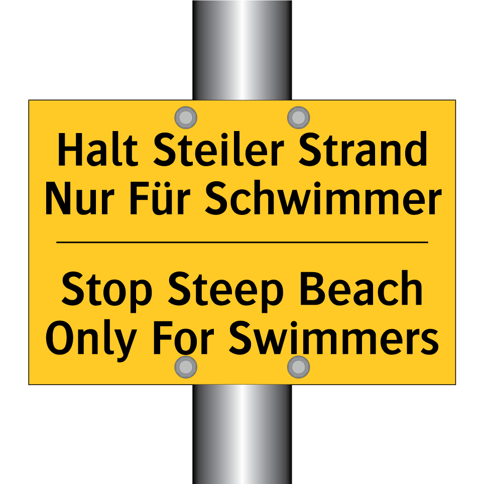 Zweisprachiges Warnschild mit deutschem Text Halt Steiler Strand Nur Für Schwimmer und englischem Text Stop Steep Beach Only For Swimmers