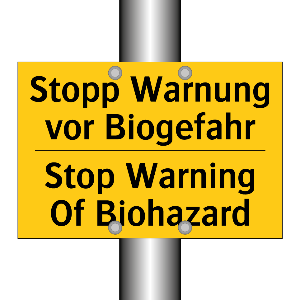 Zweisprachiges Warnschild mit deutschem Text Stopp Warnung vor Biogefahr und englischem Text Stop Warning Of Biohazard