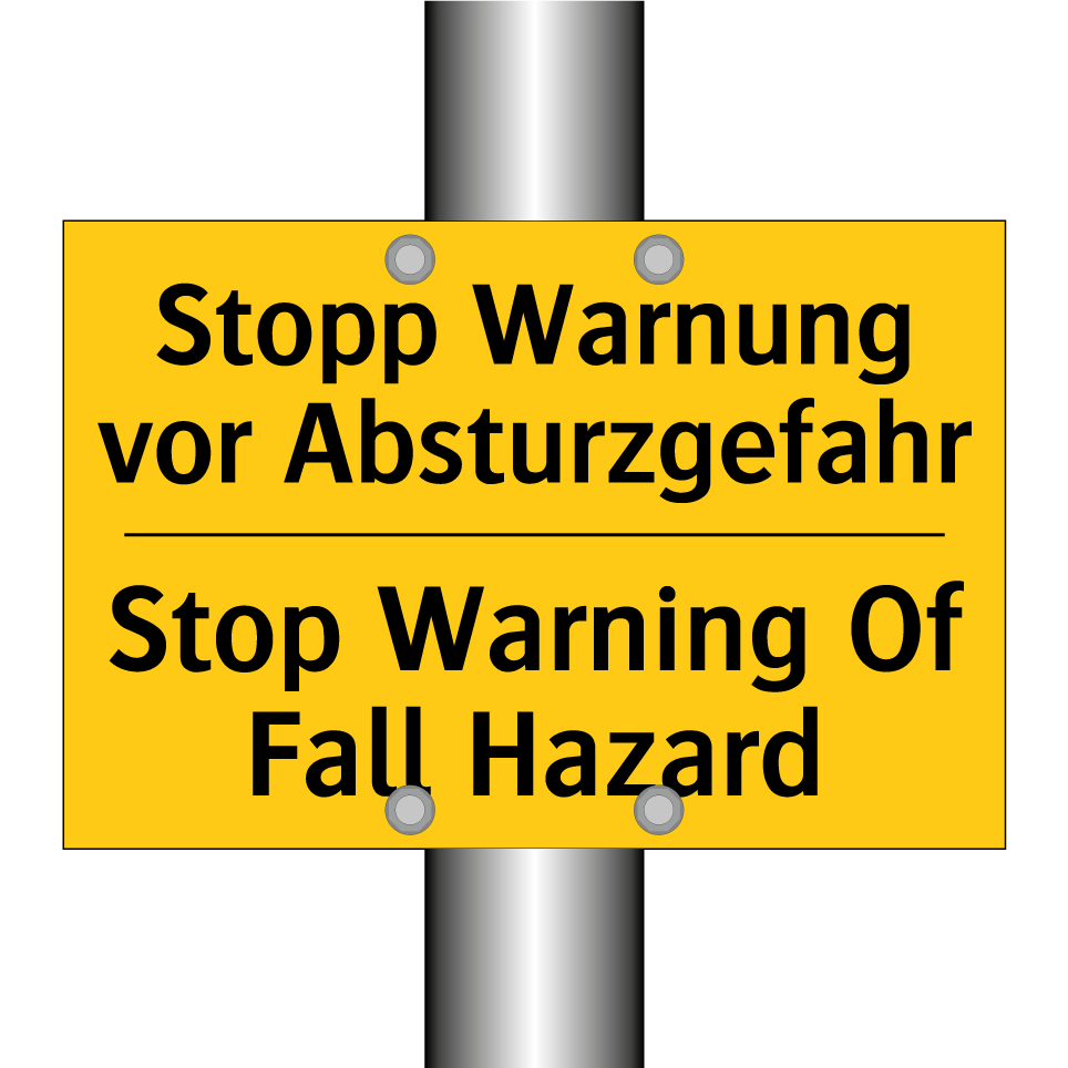 Zweisprachiges Warnschild mit deutschem Text Stopp Warnung vor Absturzgefahr und englischem Text Stop Warning Of Fall Hazard