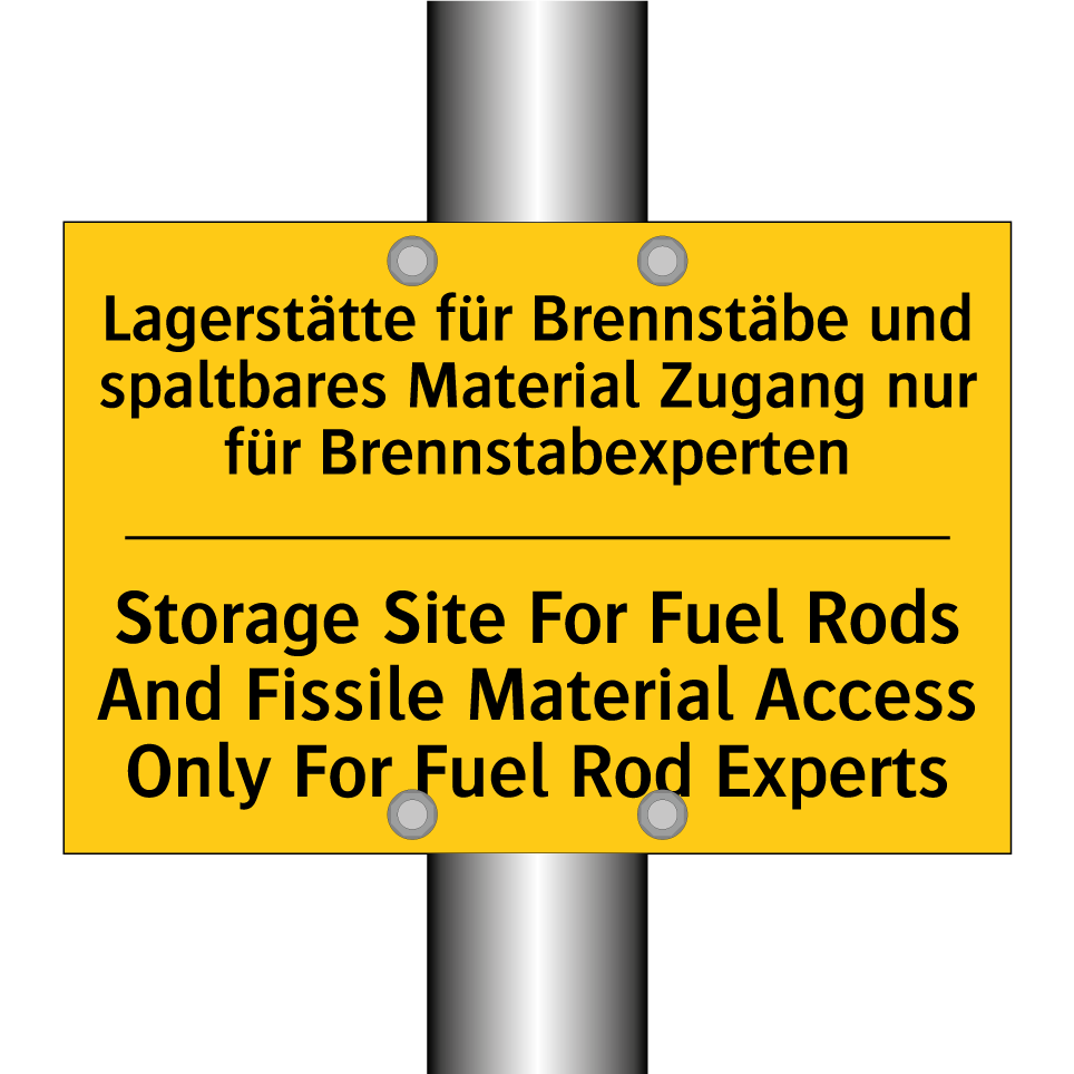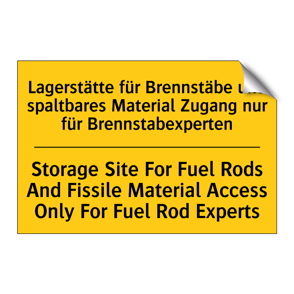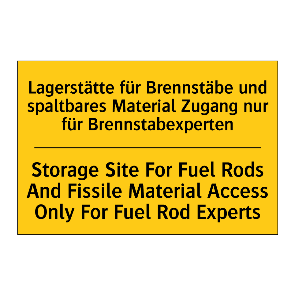 Zweisprachiges Warnschild mit deutschem Text Lagerstätte für Brennstäbe und spaltbares Material Zugang nur für Brennstabexperten und englischem Text Storage Site For Fuel Rods And Fissile Material Access Only For Fuel Rod Experts