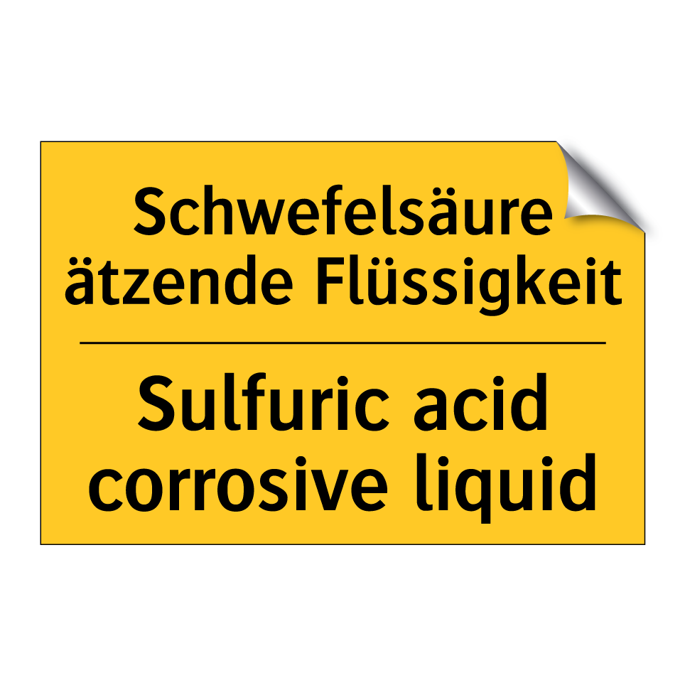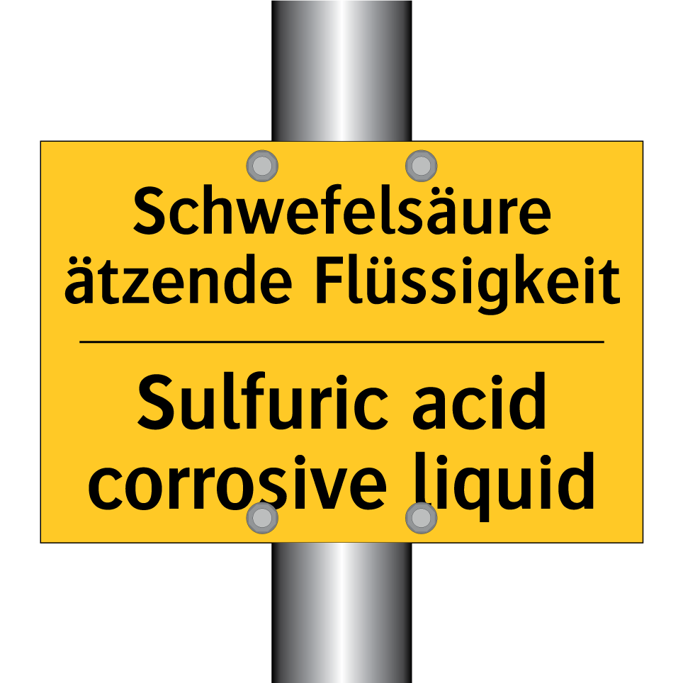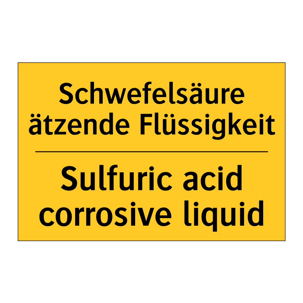 Zweisprachiges Warnschild mit deutschem Text Schwefelsäure ätzende Flüssigkeit und englischem Text Sulfuric acid corrosive liquid