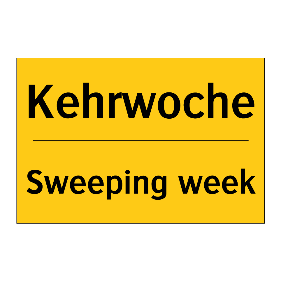 Zweisprachiges Warnschild mit deutschem Text Kehrwoche und englischem Text Sweeping week