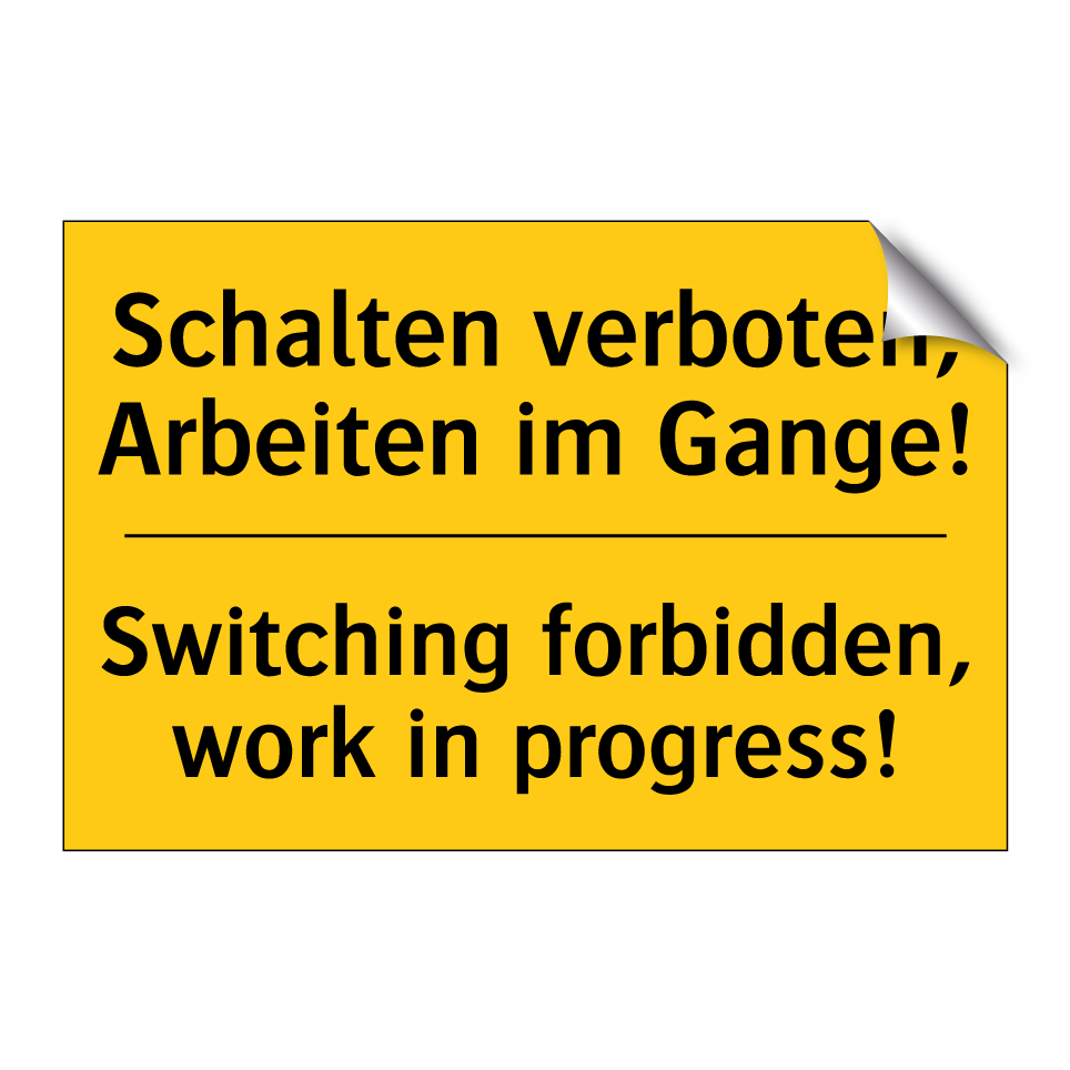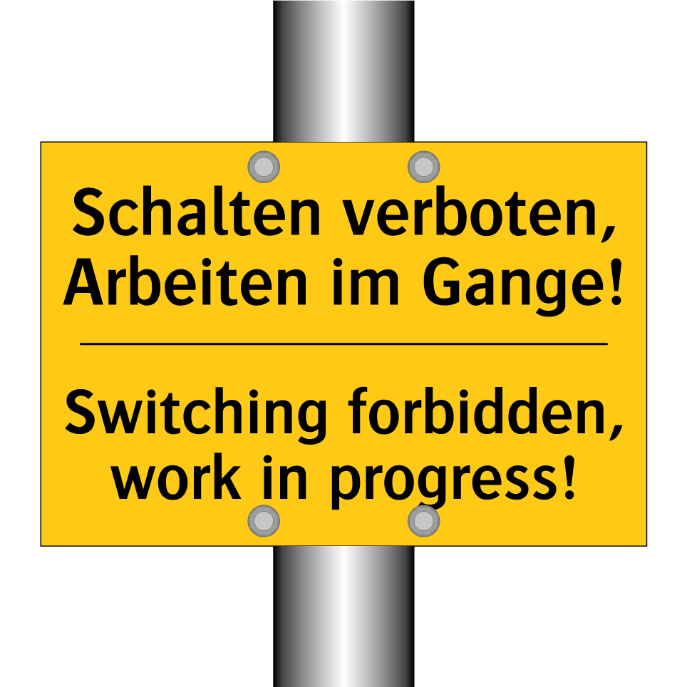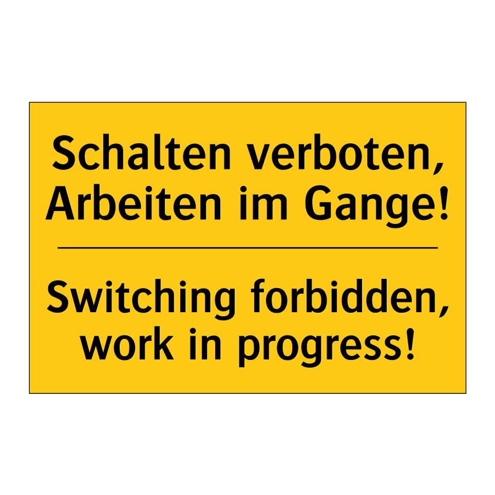 Zweisprachiges Warnschild mit deutschem Text Schalten verboten, Arbeiten im Gange! und englischem Text Switching forbidden, work in progress!