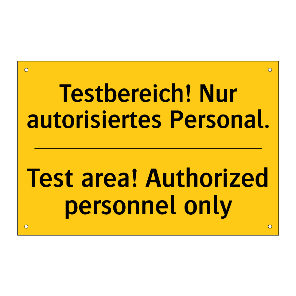 Zweisprachiges Warnschild mit deutschem Text Testbereich! Nur autorisiertes Personal. und englischem Text Test area! Authorized personnel only