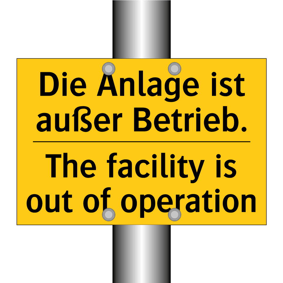 Zweisprachiges Warnschild mit deutschem Text Die Anlage ist außer Betrieb. und englischem Text The facility is out of operation