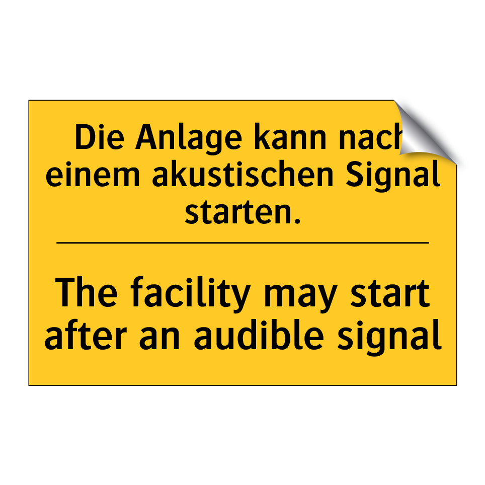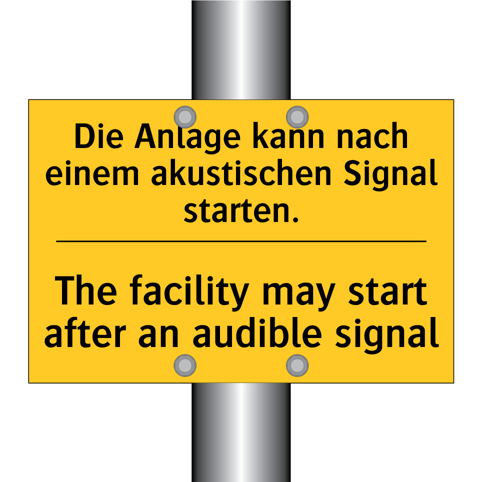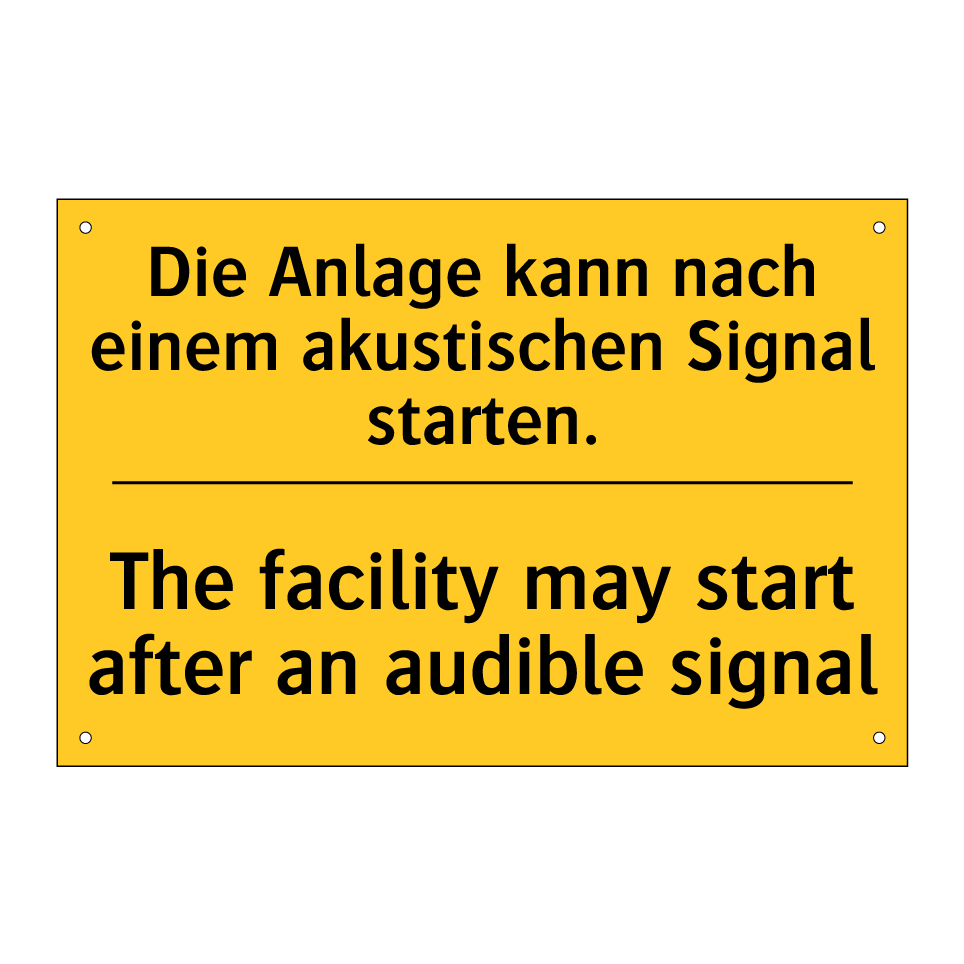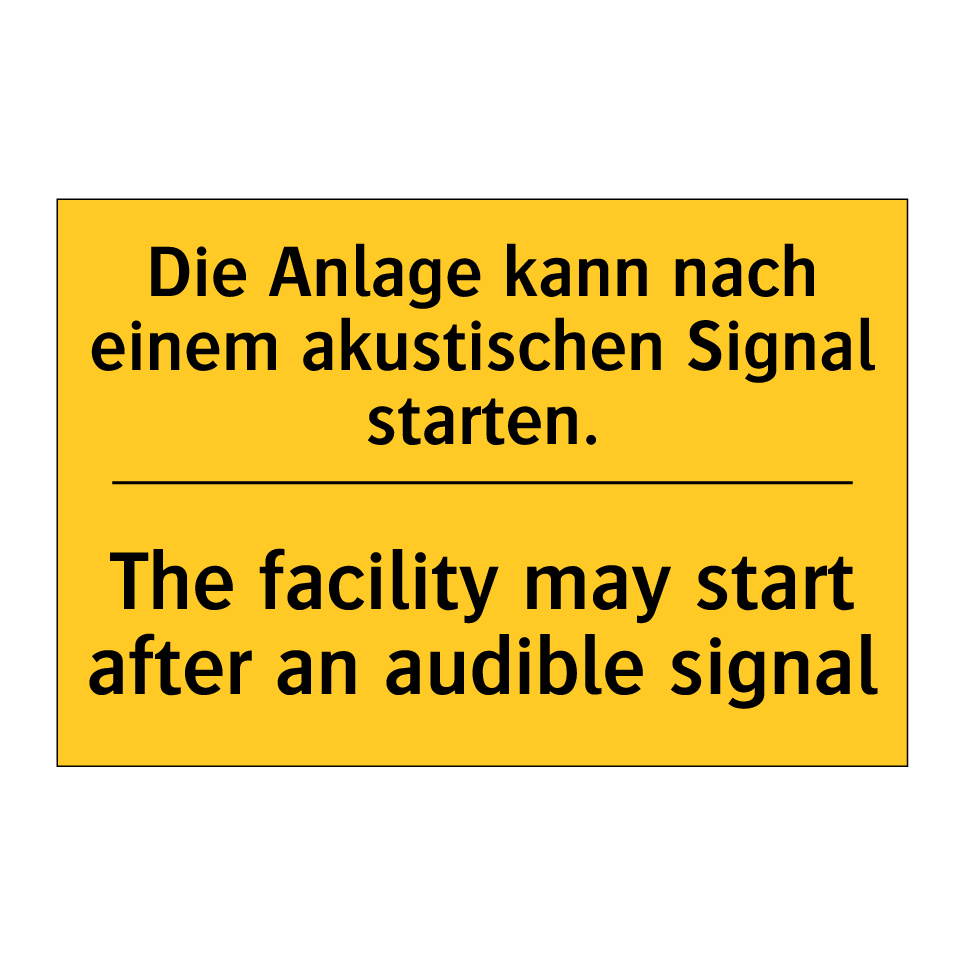 Zweisprachiges Warnschild mit deutschem Text Die Anlage kann nach einem akustischen Signal starten. und englischem Text The facility may start after an audible signal