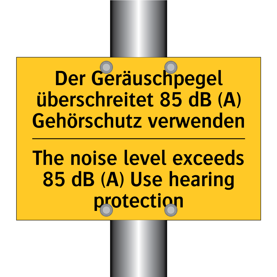 Zweisprachiges Warnschild mit deutschem Text Der Geräuschpegel überschreitet 85 dB (A) Gehörschutz verwenden und englischem Text The noise level exceeds 85 dB (A) Use hearing protection