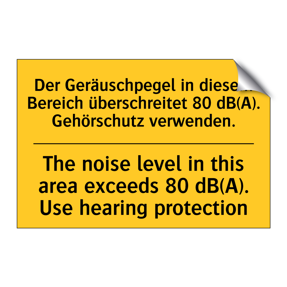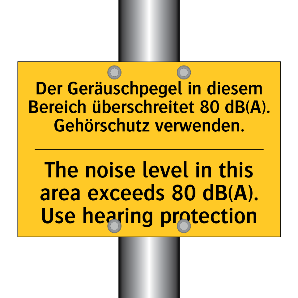 Zweisprachiges Warnschild mit deutschem Text Der Geräuschpegel in diesem Bereich überschreitet 80 dB(A). Gehörschutz verwenden. und englischem Text The noise level in this area exceeds 80 dB(A). Use hearing protection