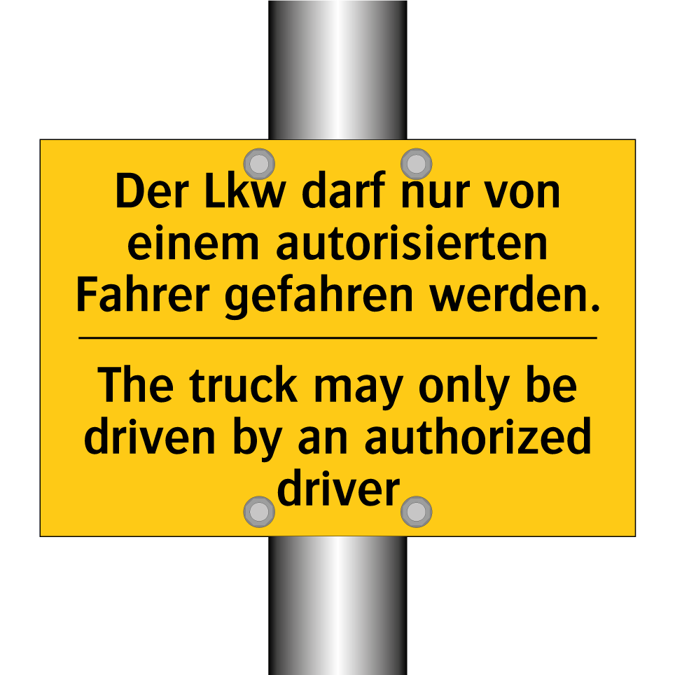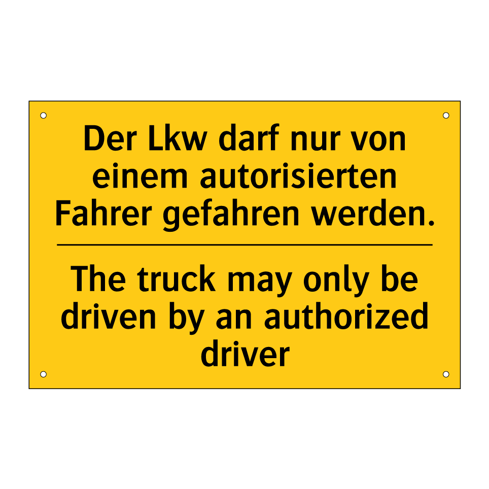 Zweisprachiges Warnschild mit deutschem Text Der Lkw darf nur von einem autorisierten Fahrer gefahren werden. und englischem Text The truck may only be driven by an authorized driver