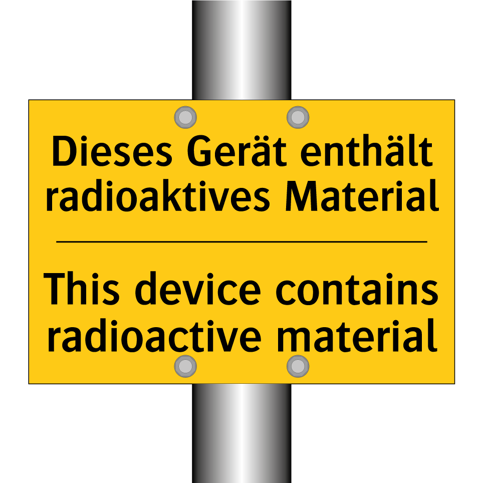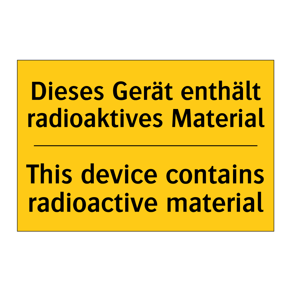 Zweisprachiges Warnschild mit deutschem Text Dieses Gerät enthält radioaktives Material und englischem Text This device contains radioactive material