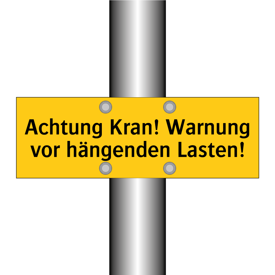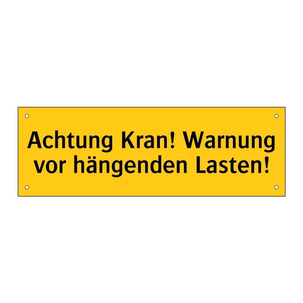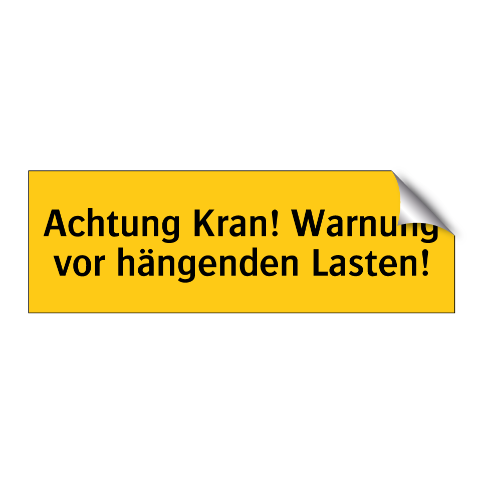 Warnschild mit dem Text Achtung Kran! Warnung vor hängenden Lasten!