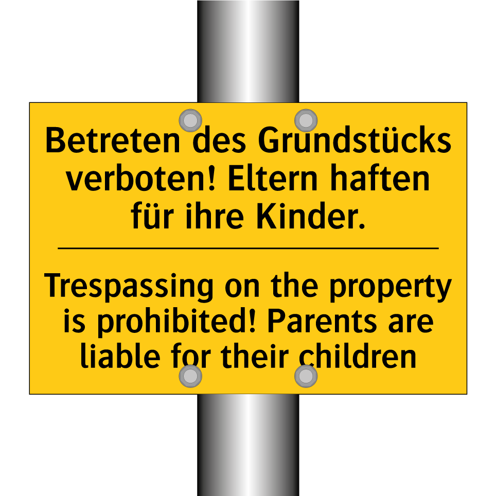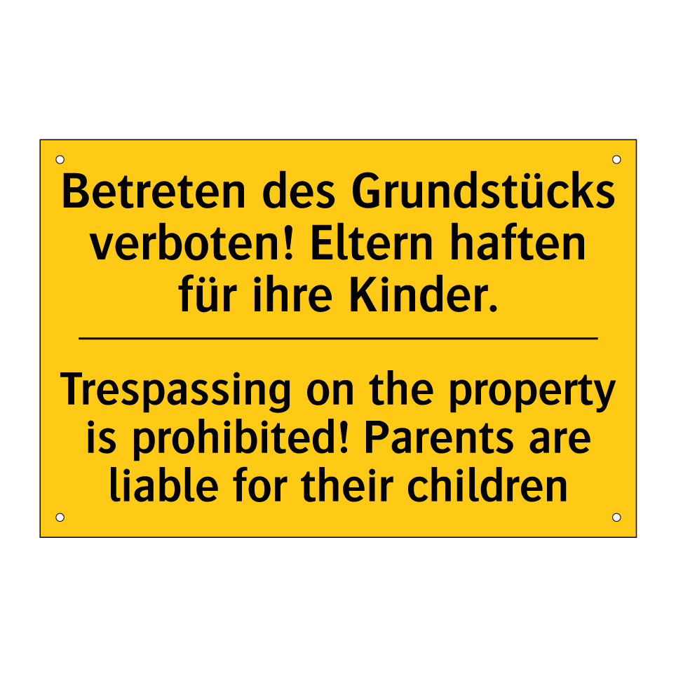 Zweisprachiges Warnschild mit deutschem Text Betreten des Grundstücks verboten! Eltern haften für ihre Kinder. und englischem Text Trespassing on the property is prohibited! Parents are liable for their children