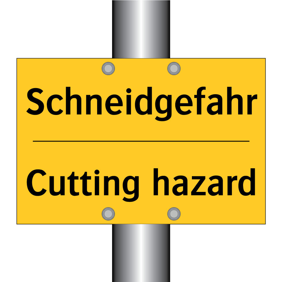 Zweisprachiges Warnschild mit deutschem Text Schneidgefahr und englischem Text Cutting hazard
