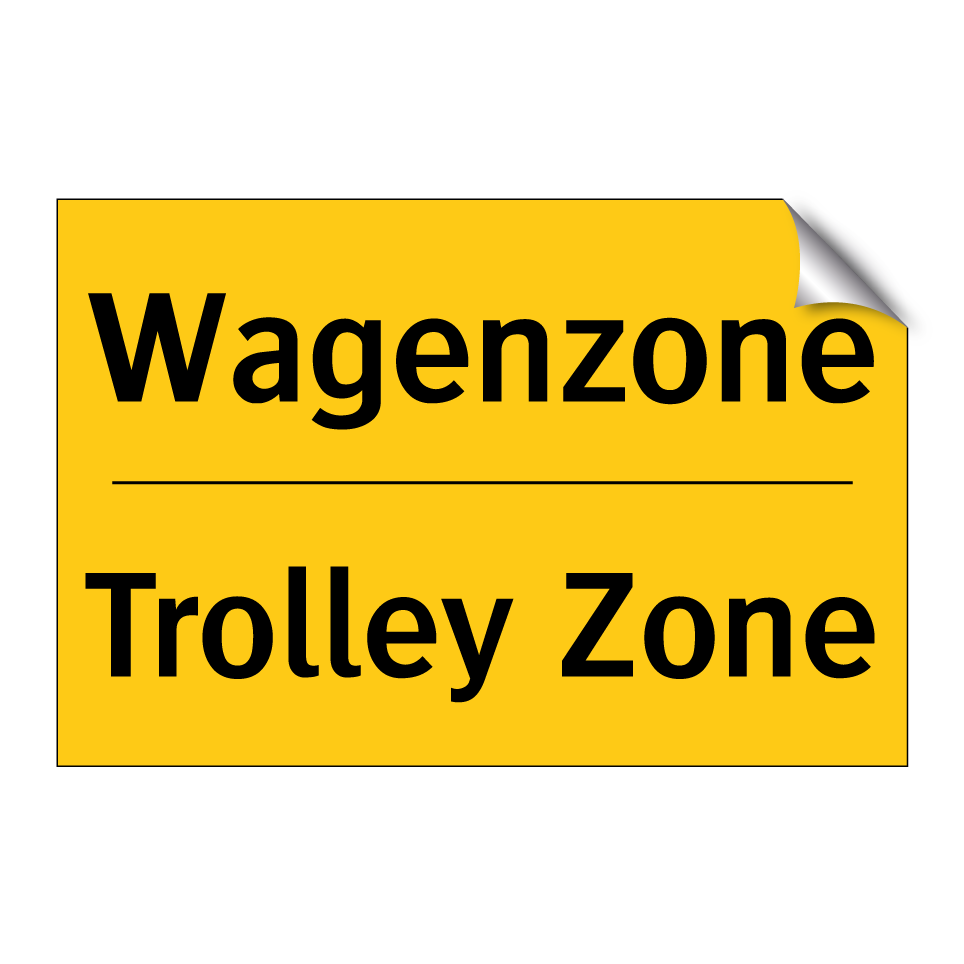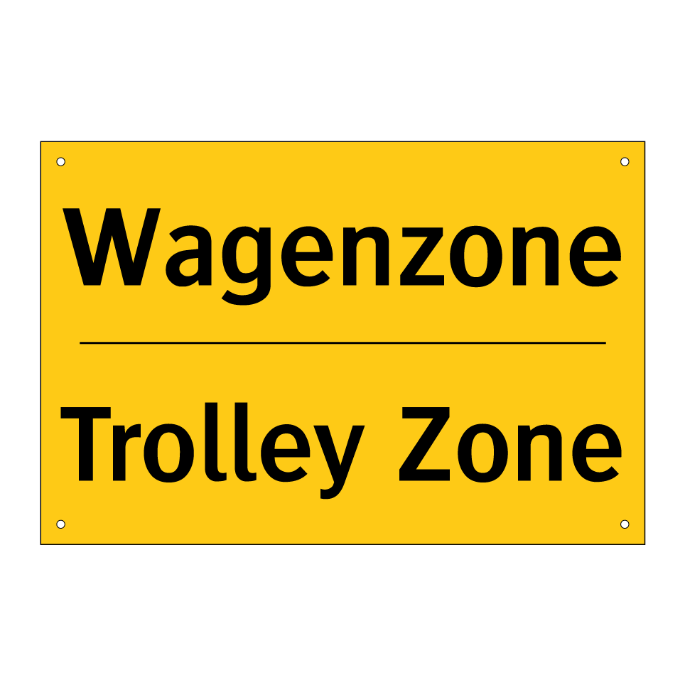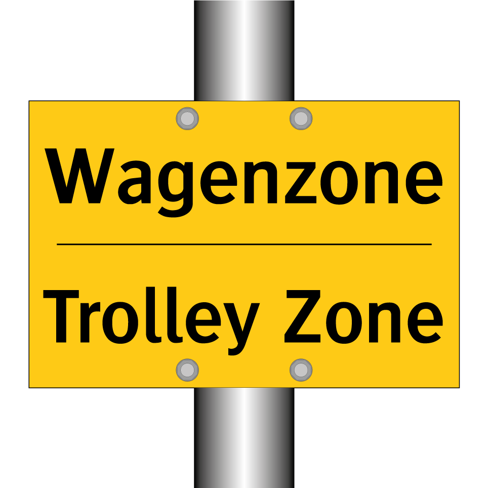 Zweisprachiges Warnschild mit deutschem Text Wagenzone und englischem Text Trolley Zone