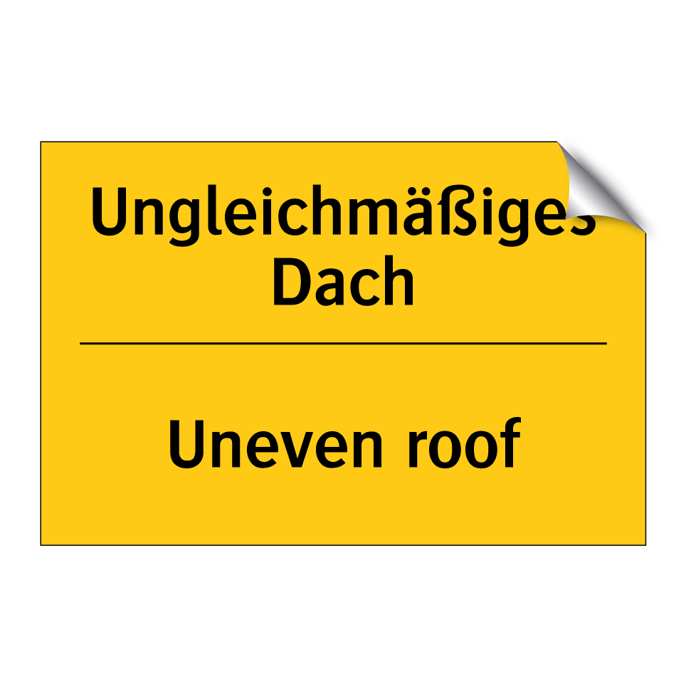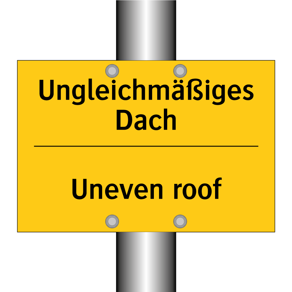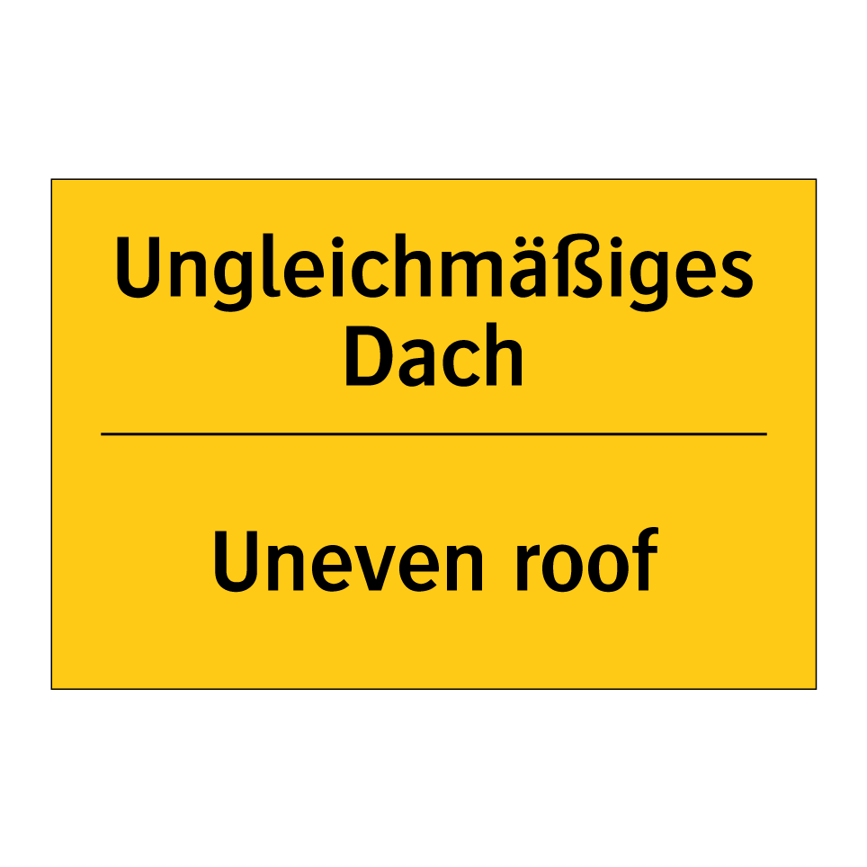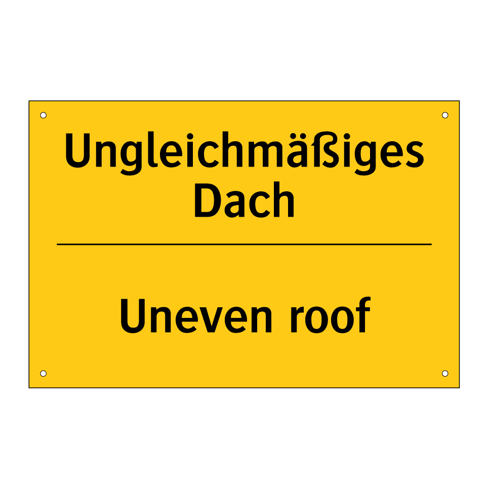 Zweisprachiges Warnschild mit deutschem Text Ungleichmäßiges Dach und englischem Text Uneven roof